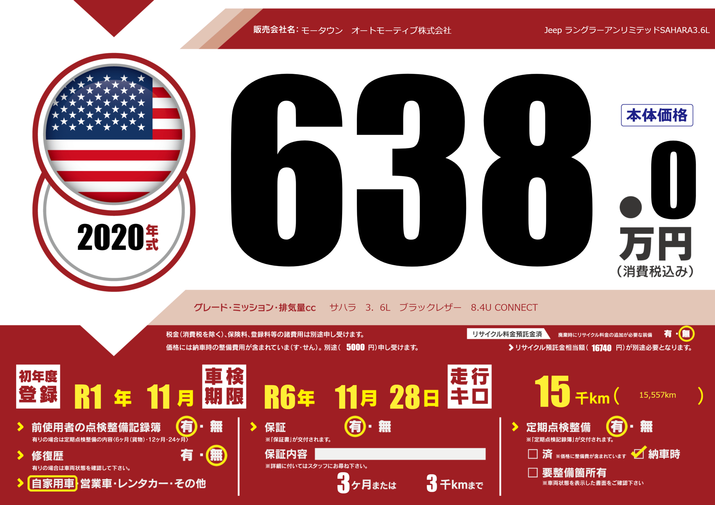 | 車名 | Jeep ラングラーアンリミテッドSAHARA3.6L | グレード ミッション 排気量 |