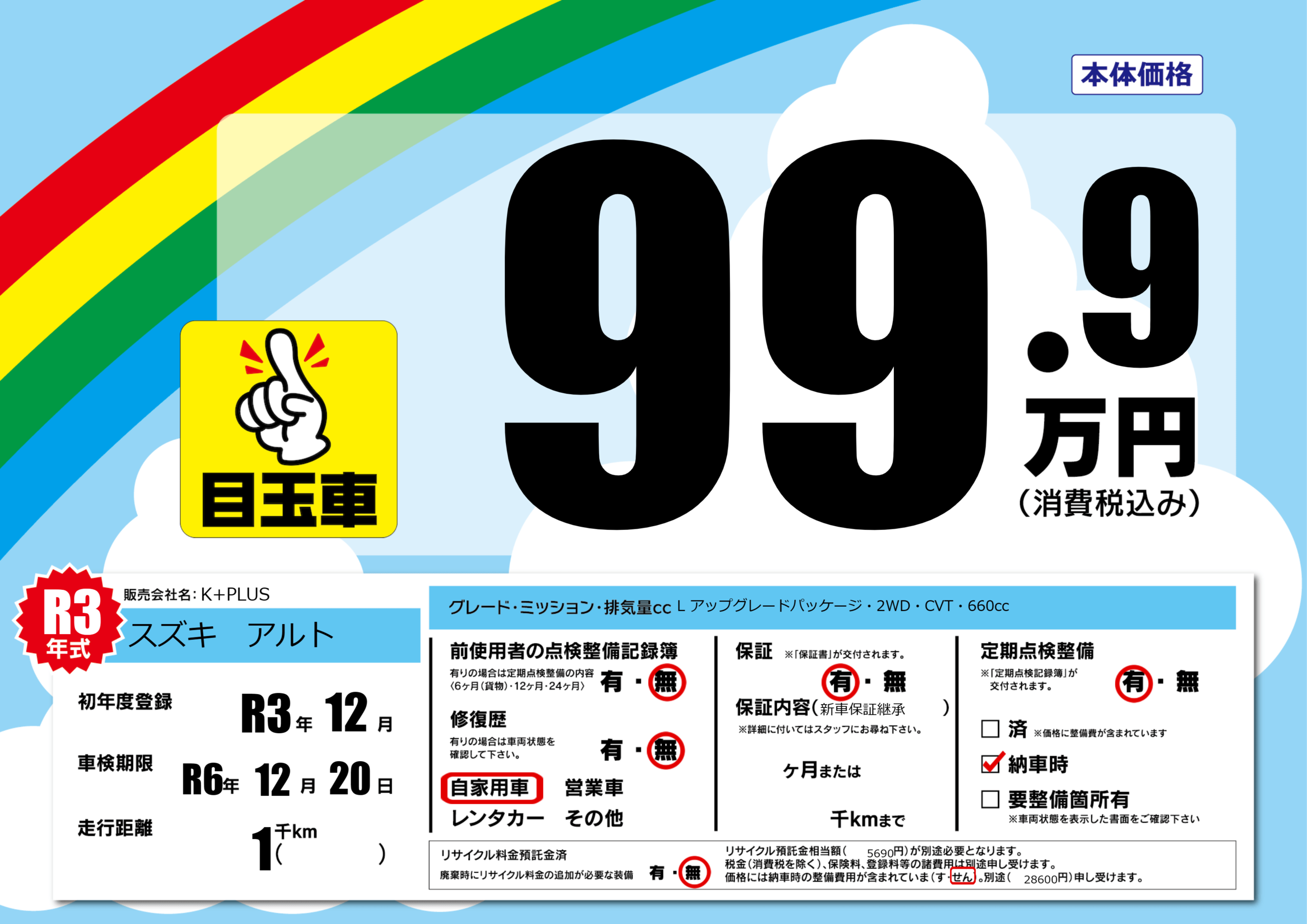 | 走行キロ | 0.1万km | 初年度登録 | R3年12月 |