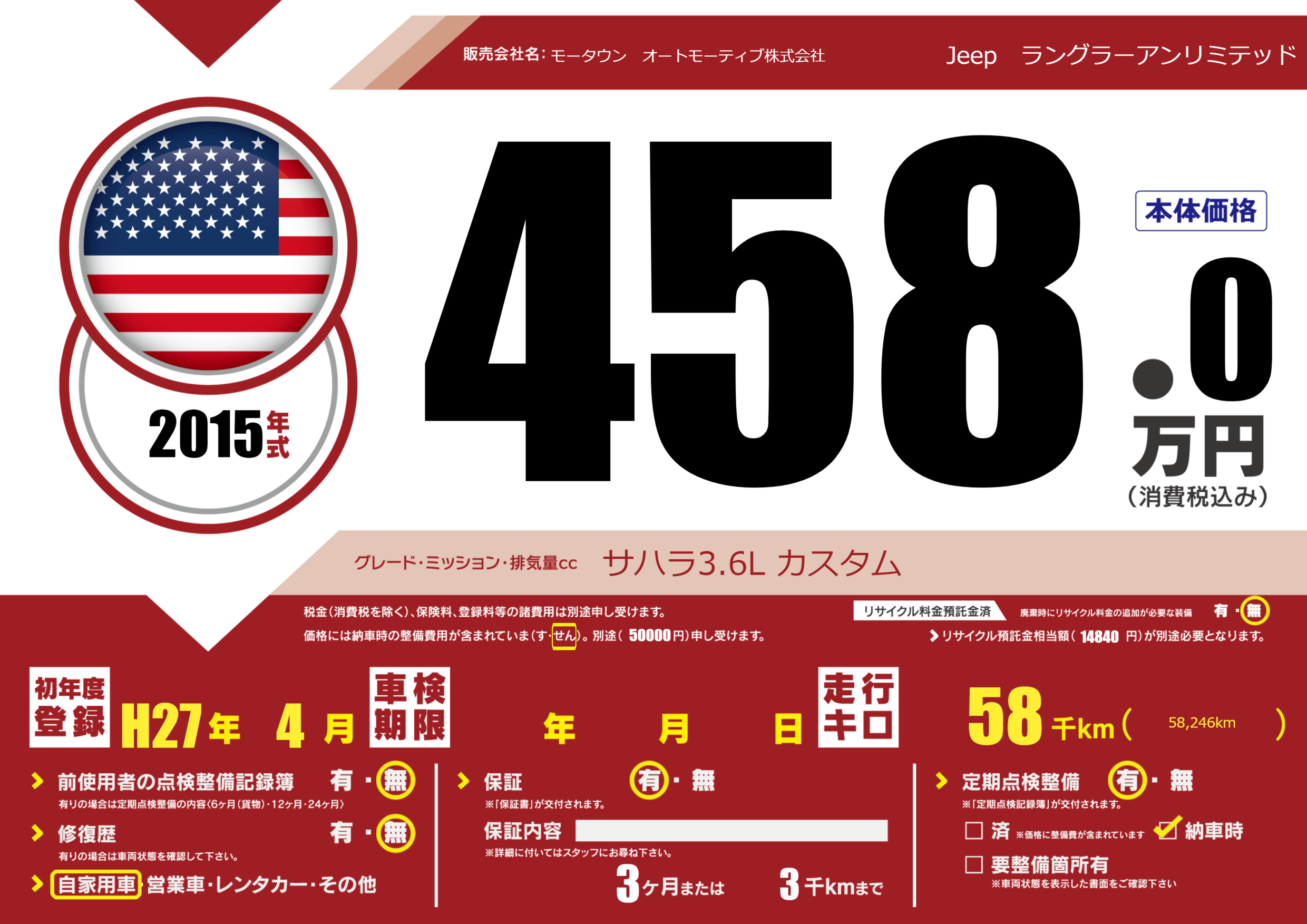 保証付き 保証内容(---) 3ヶ月または(3)千kmまで |