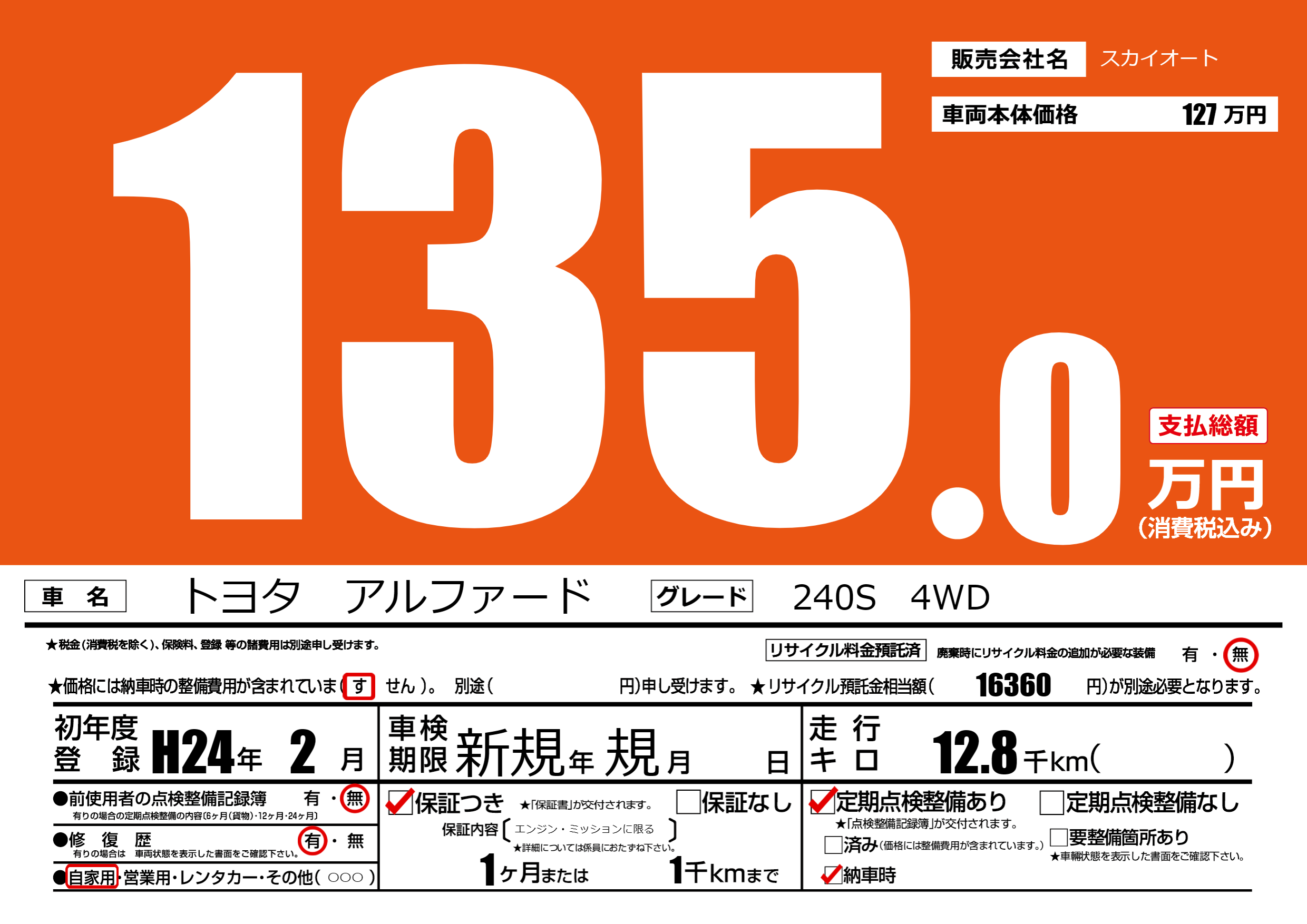 | 車名 | トヨタ アルファード | グレード ミッション 排気量 |