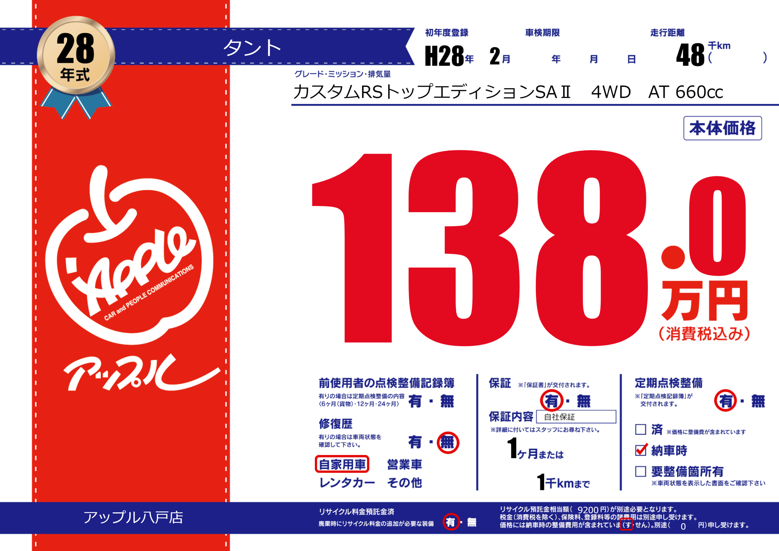 | 走行キロ | 4.8万km | 初年度登録 | H28年2月 |
