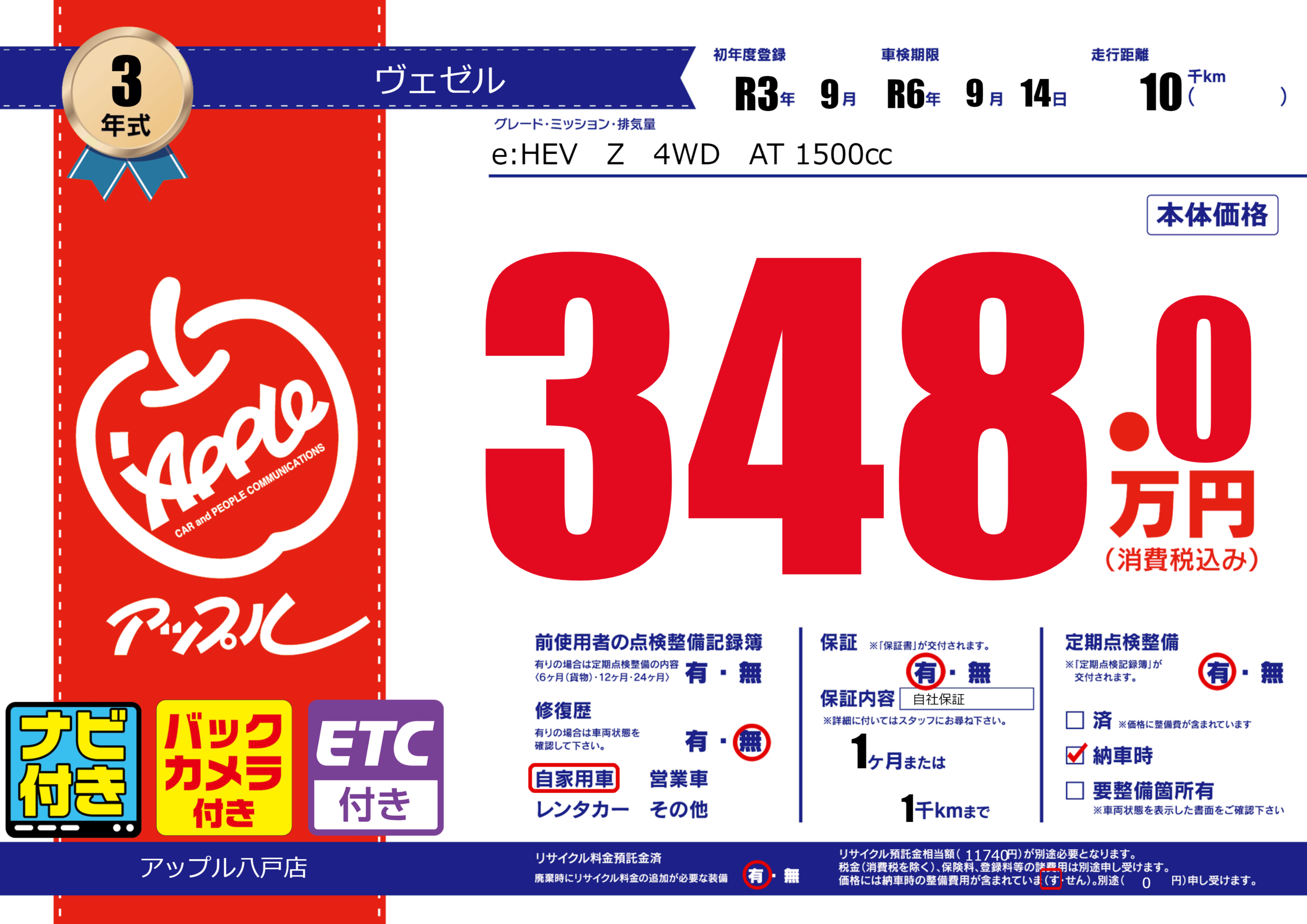 | 走行キロ | 1万km | 初年度登録 | R3年9月 |