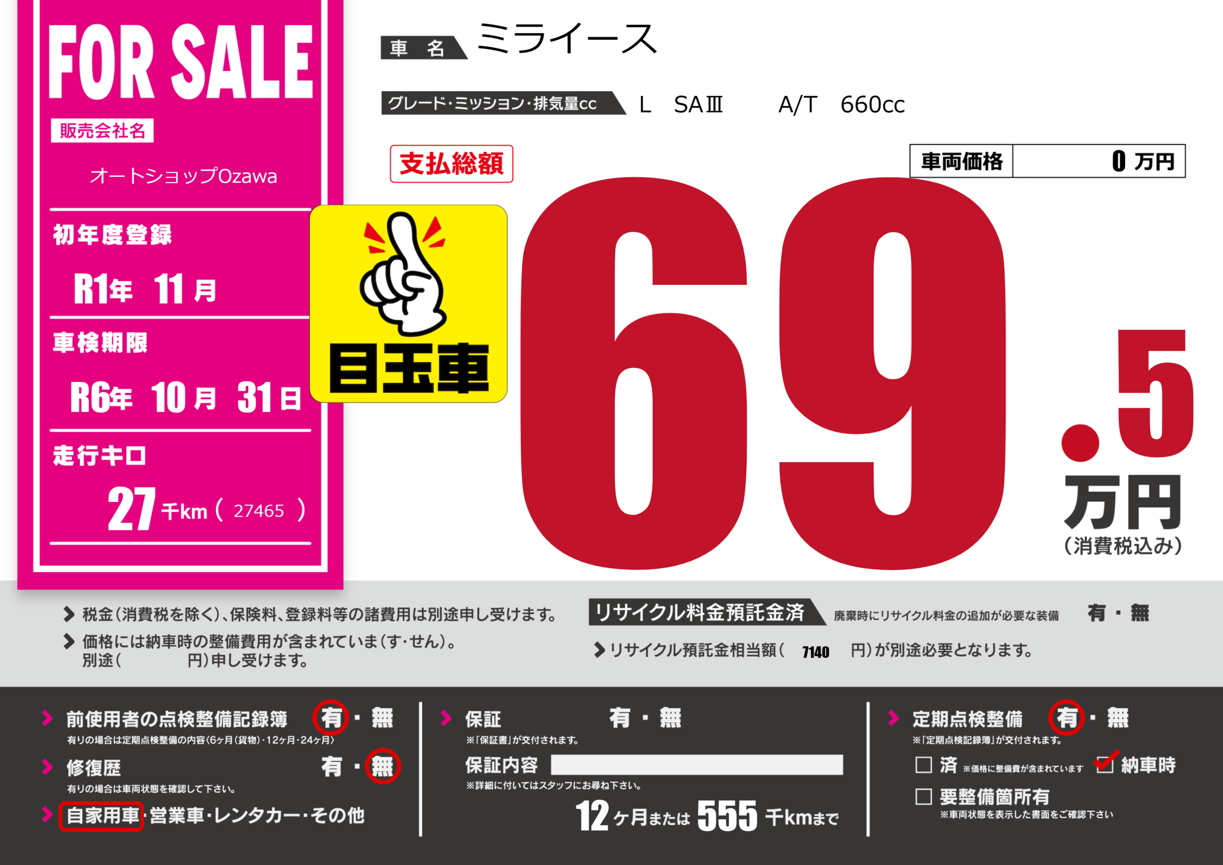 | 定期点検整備 | 定期点検整備あり 納車時あり | ||