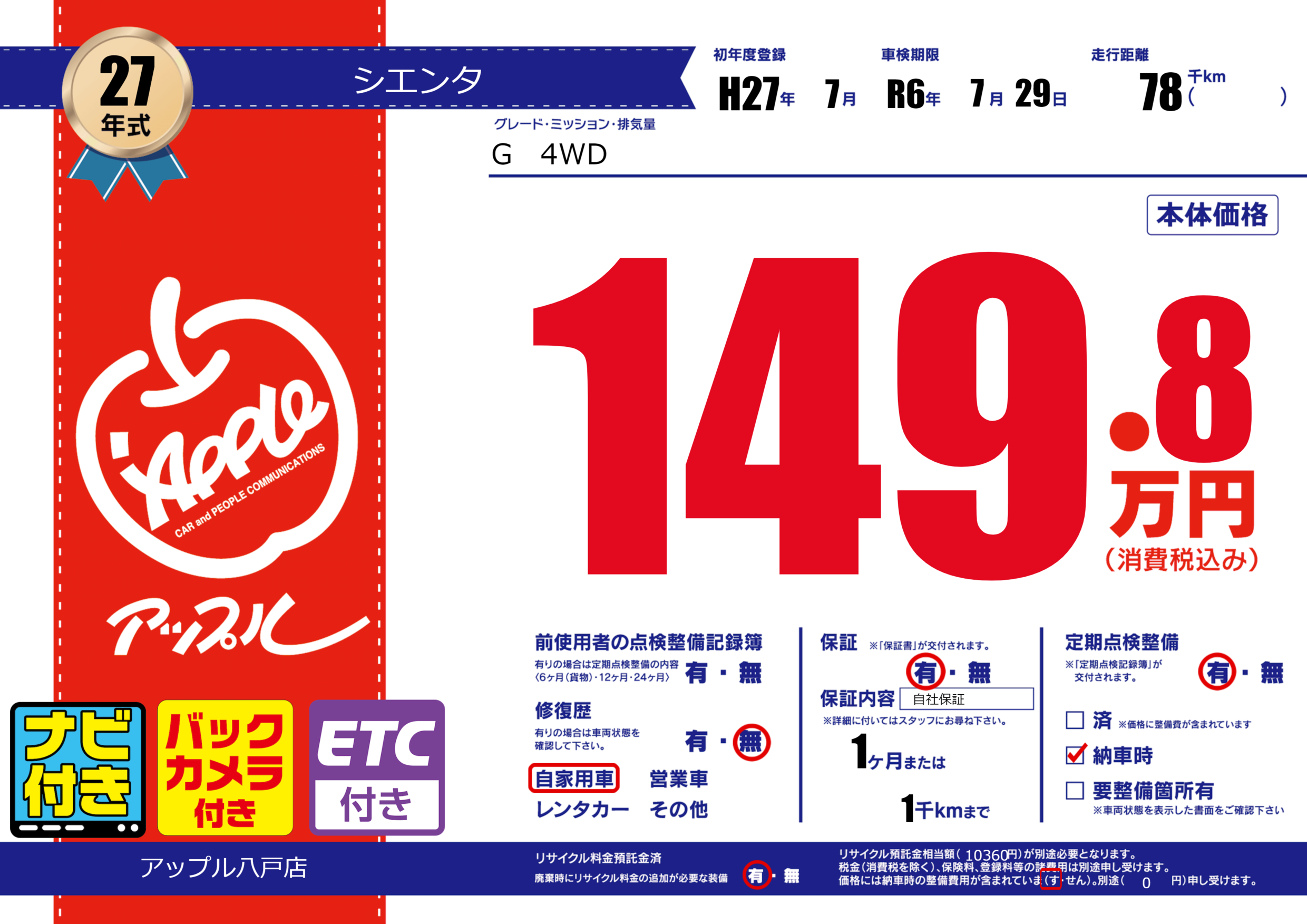 | 車名 | シエンタ | グレード ミッション 排気量 |
