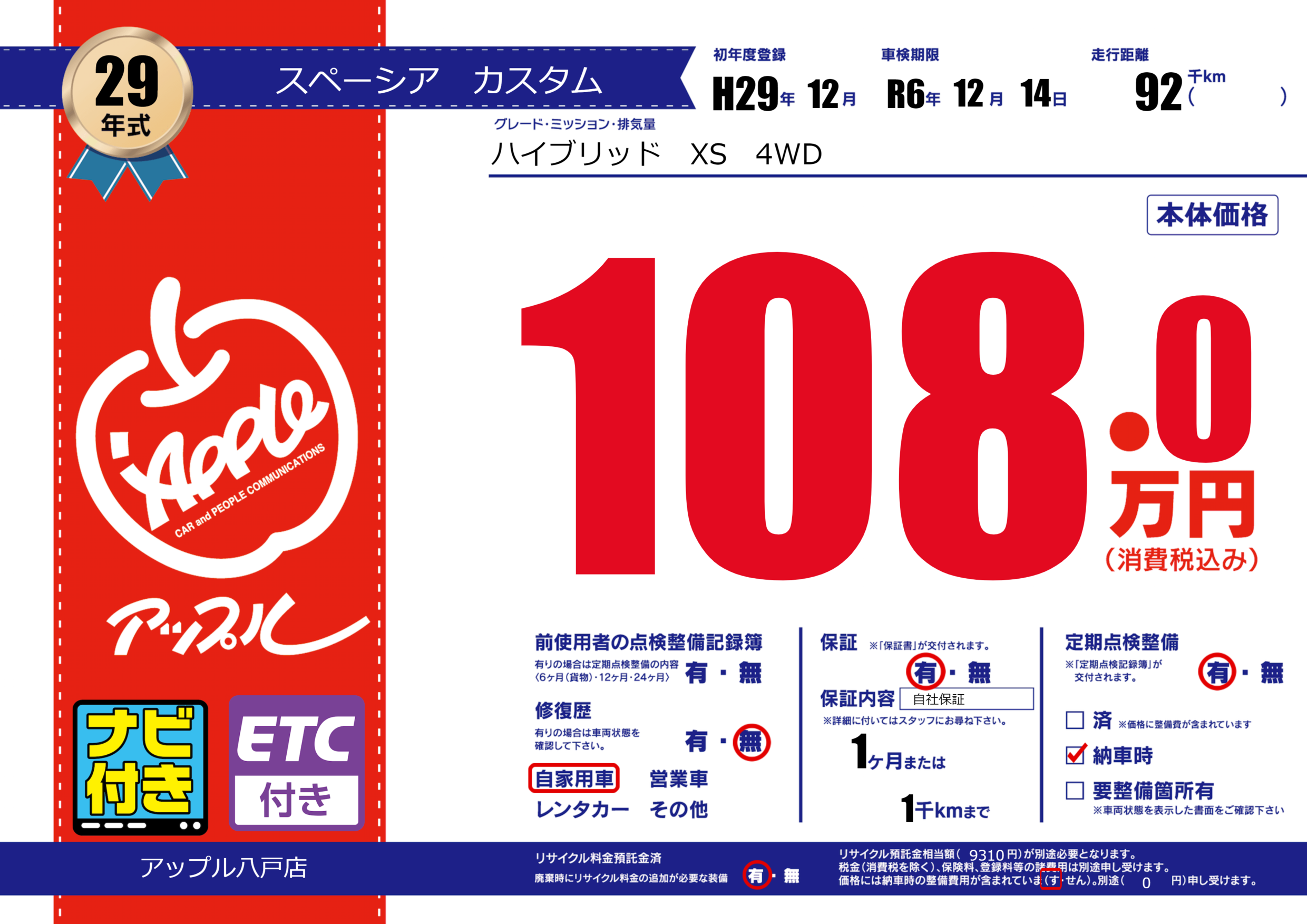 | 車名 | スペーシア カスタム | グレード ミッション 排気量 |