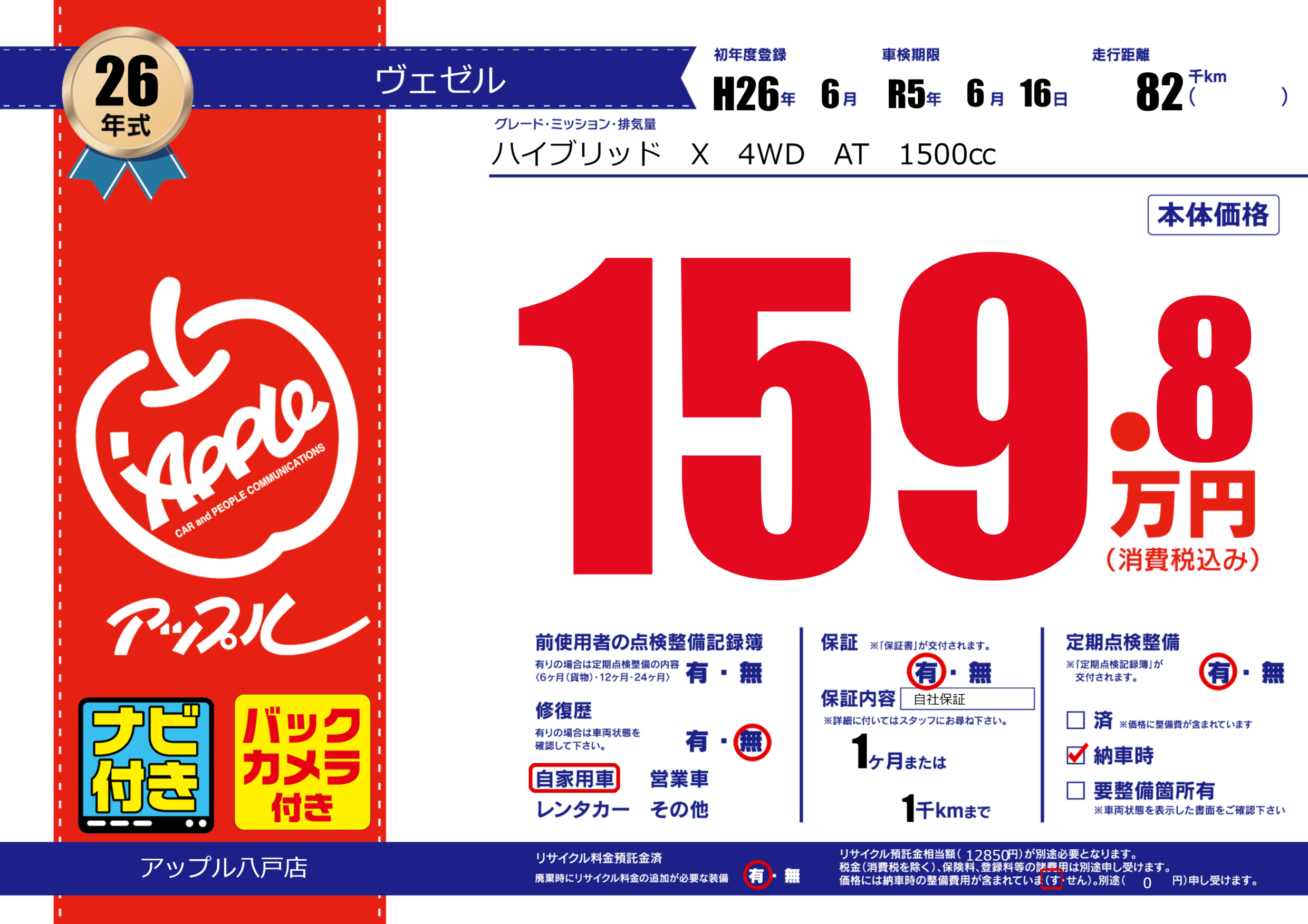 | 走行キロ | 8.2万km | 初年度登録 | H26年6月 |