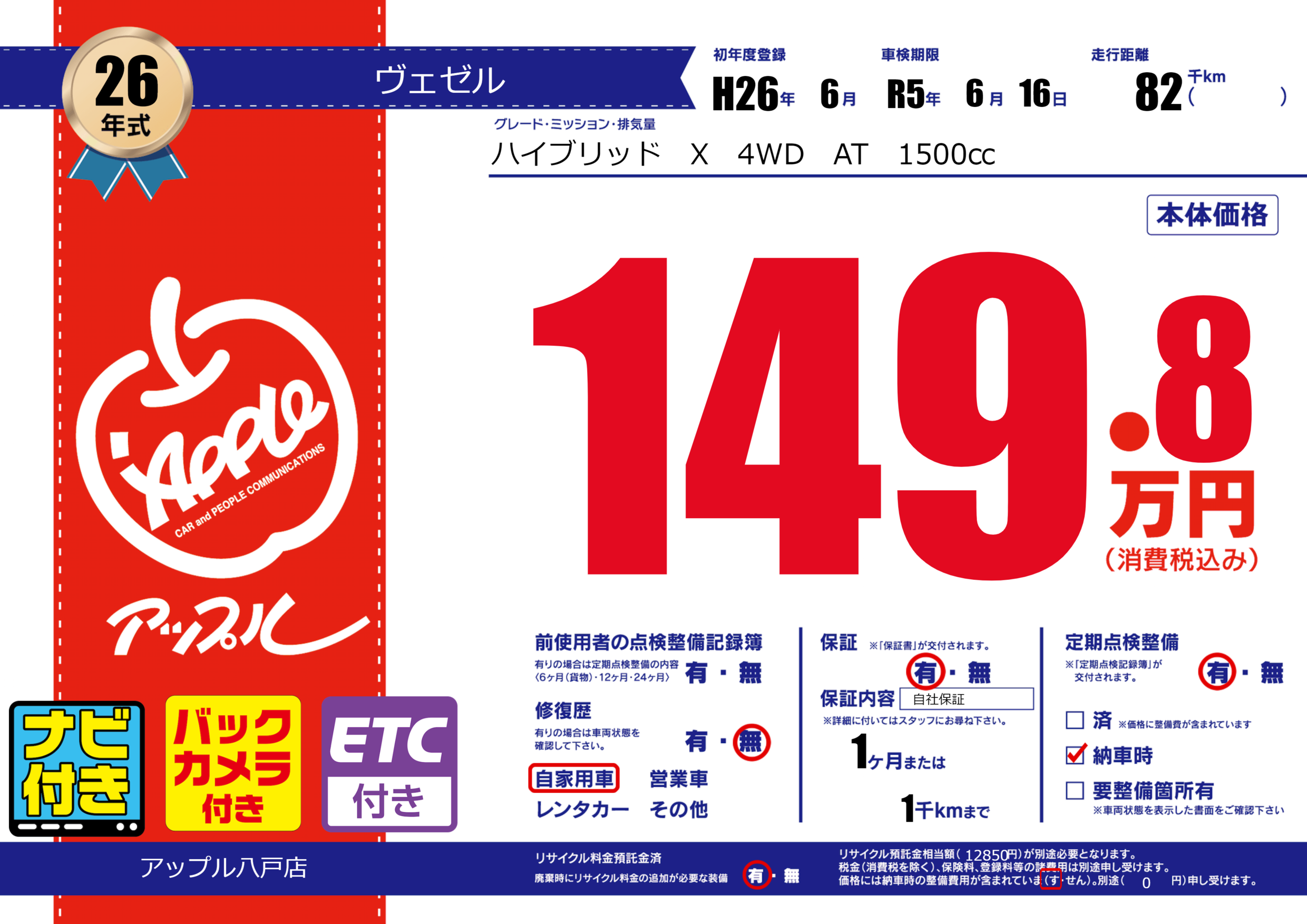 | 車名 | ヴェゼル | グレード ミッション 排気量 |
