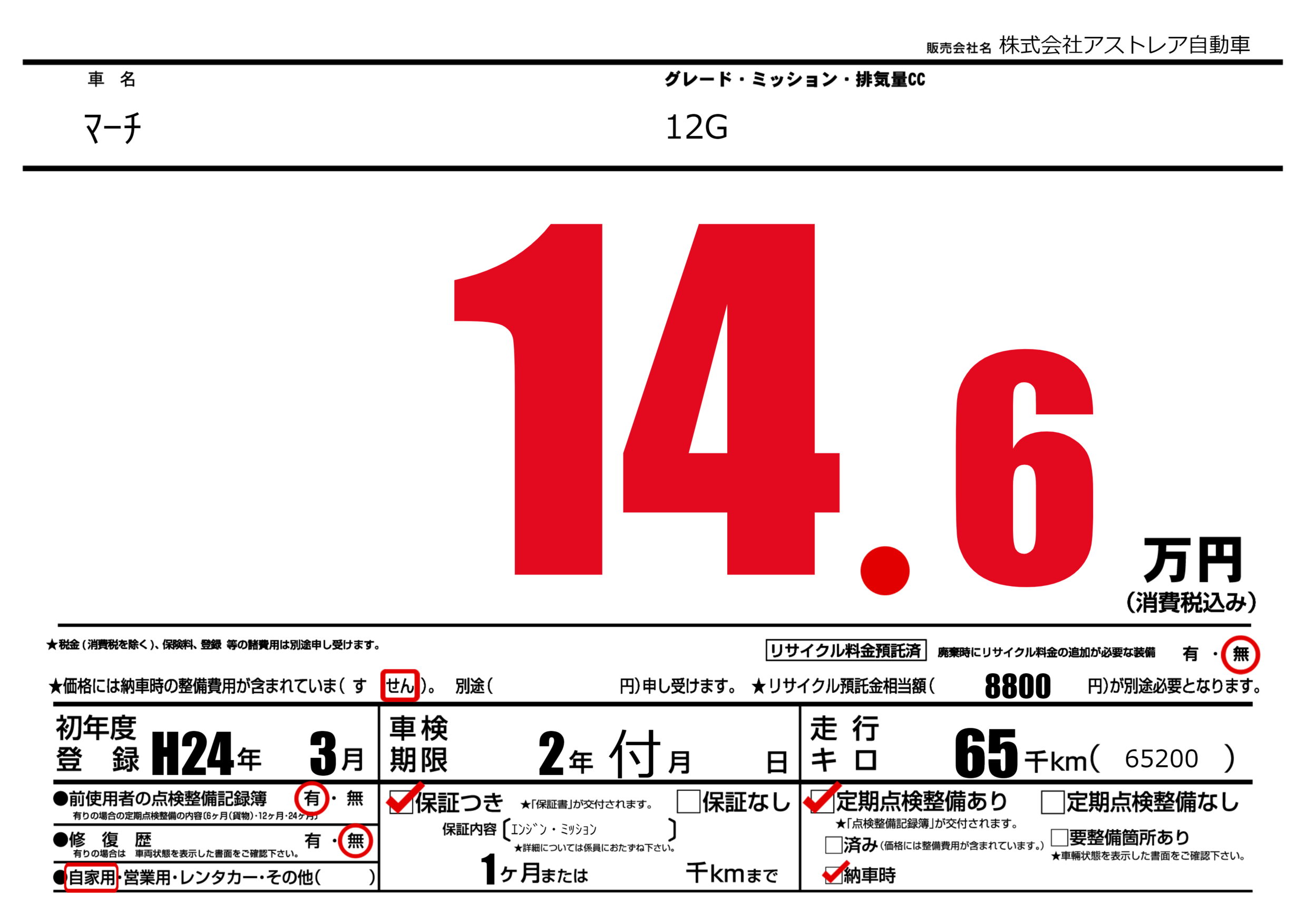 | 車名 | マーチ | グレード ミッション 排気量 |