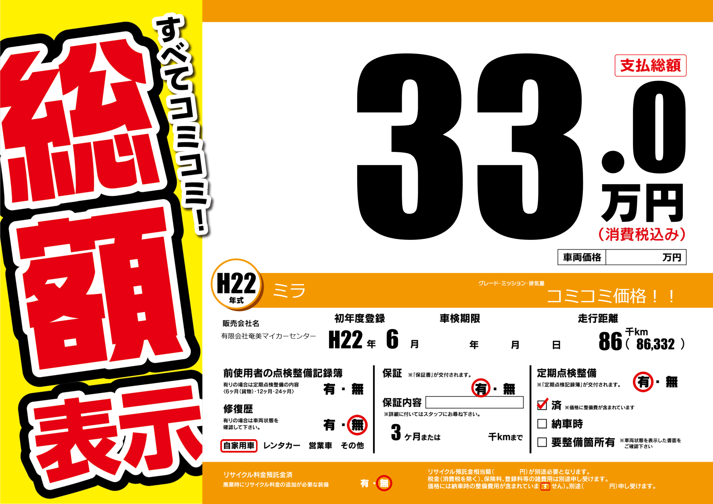 | 定期点検整備 | 定期点検整備あり 定期点検整備済み | ||