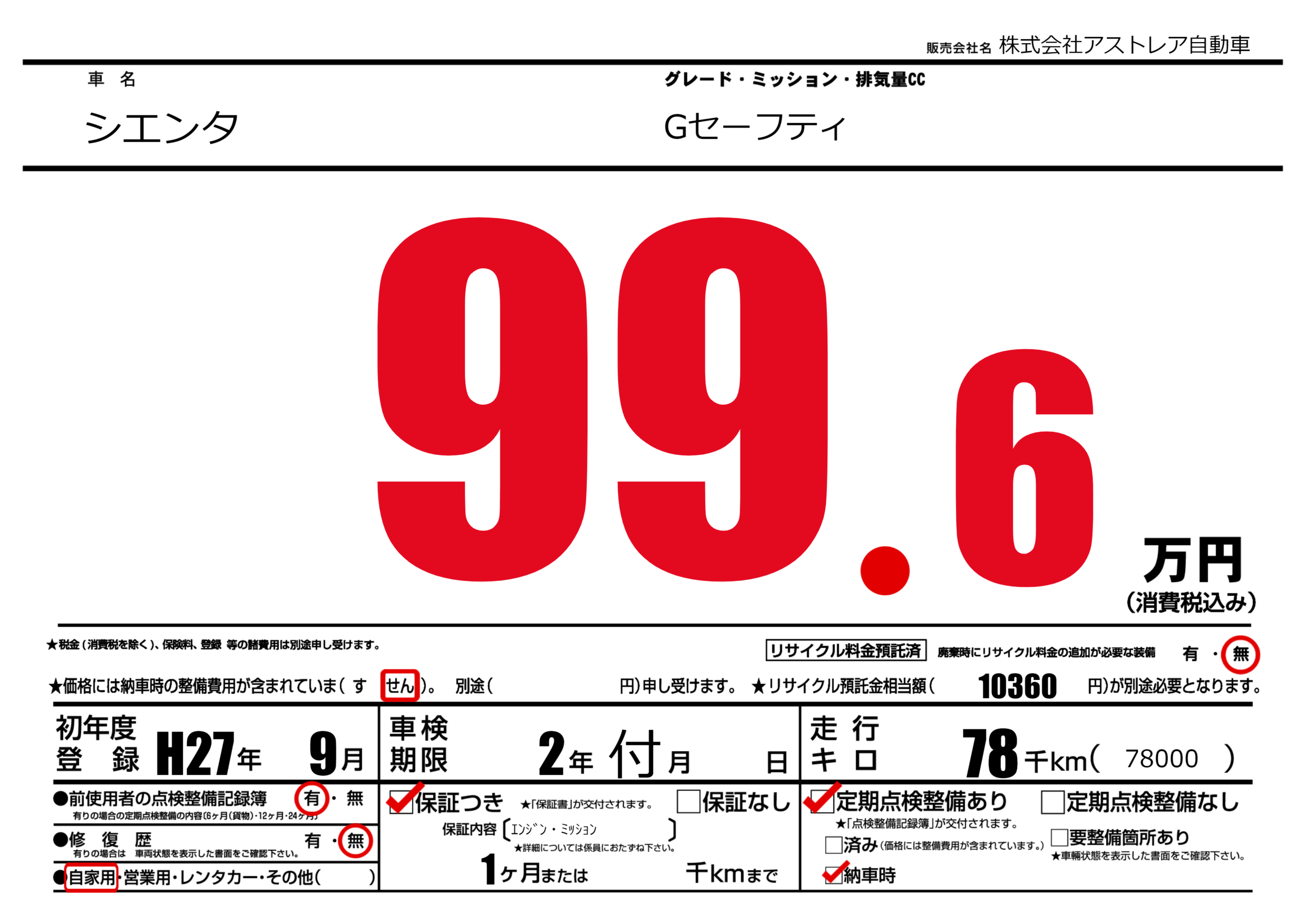 | 車名 | シエンタ | グレード ミッション 排気量 |