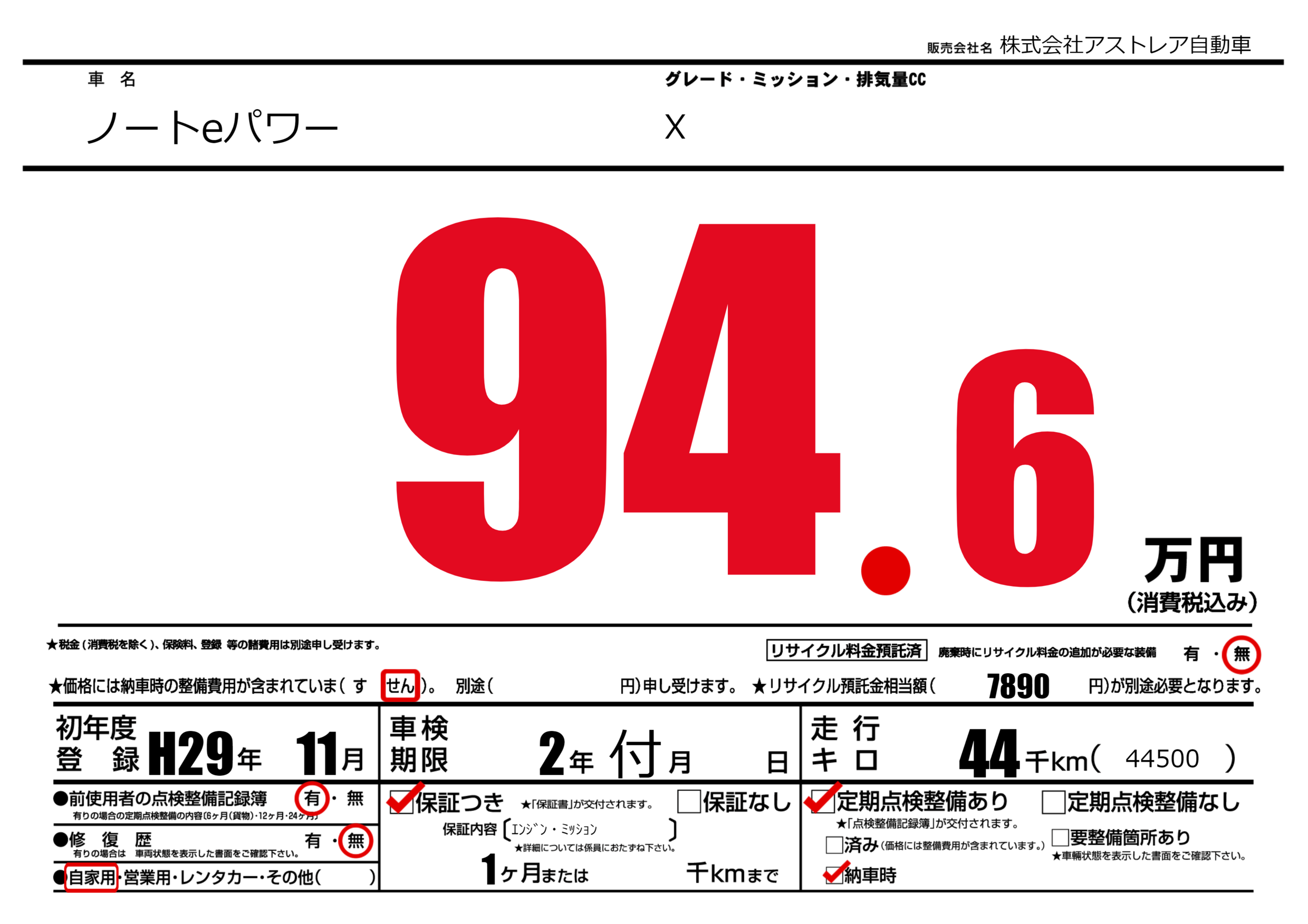 | 車名 | ノートeパワー | グレード ミッション 排気量 |