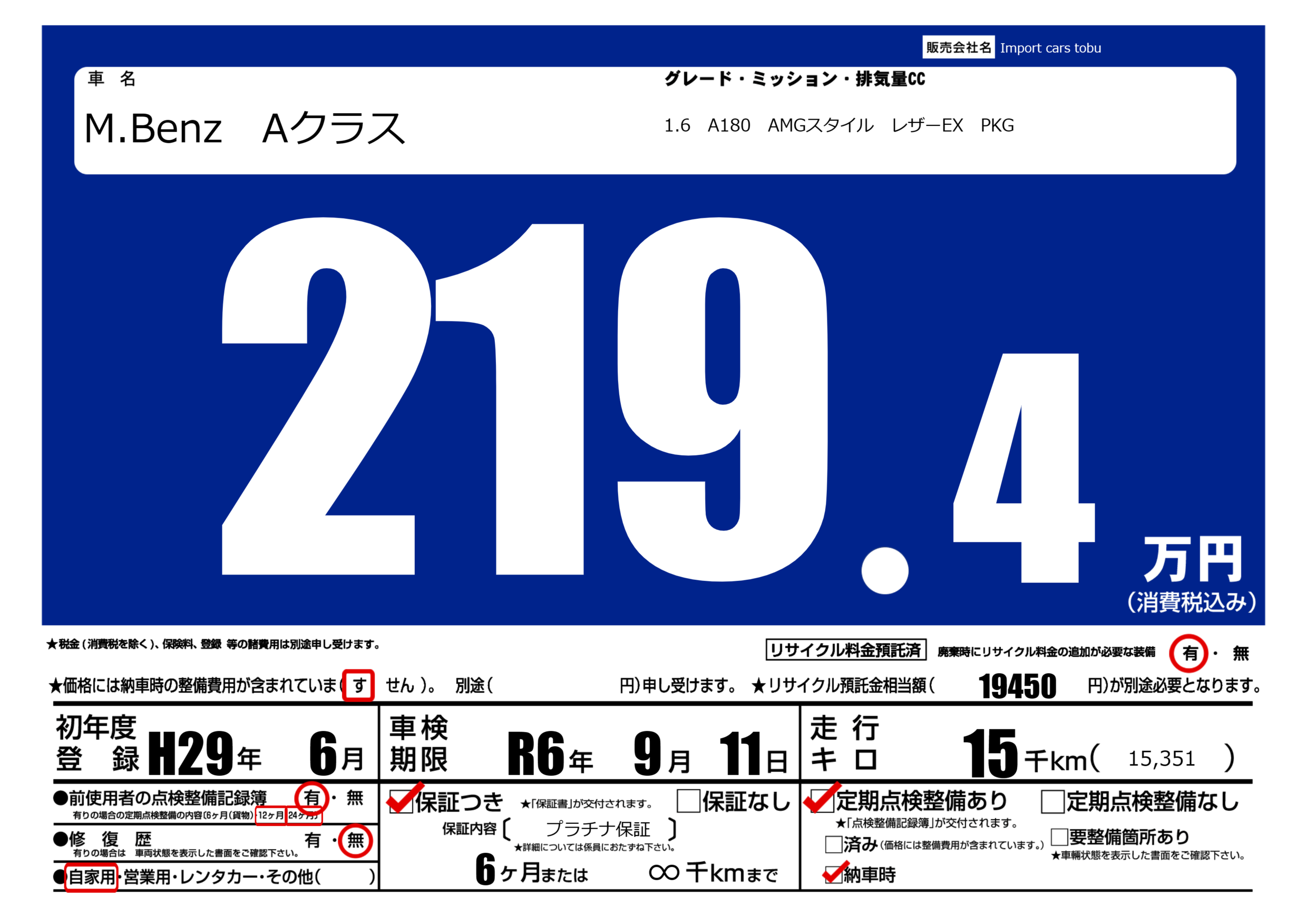 | 車名 | M.Benz Aクラス | グレード ミッション 排気量 |