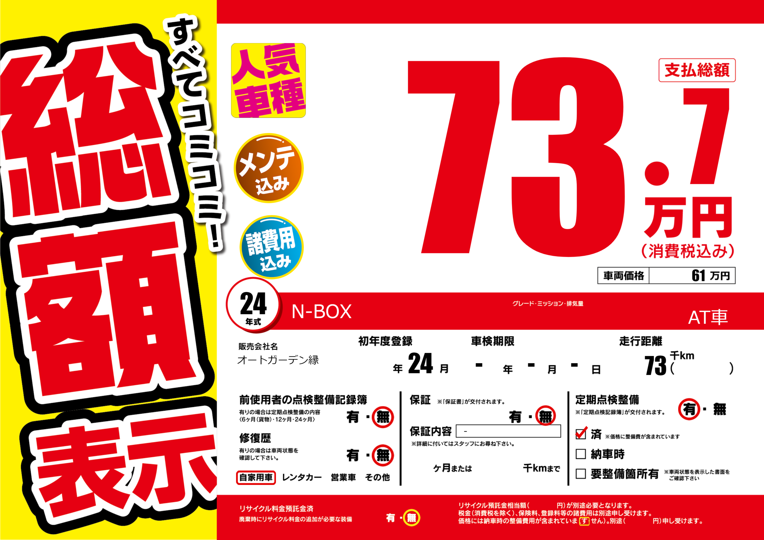 | 定期点検整備 | 定期点検整備あり 定期点検整備済み | ||
