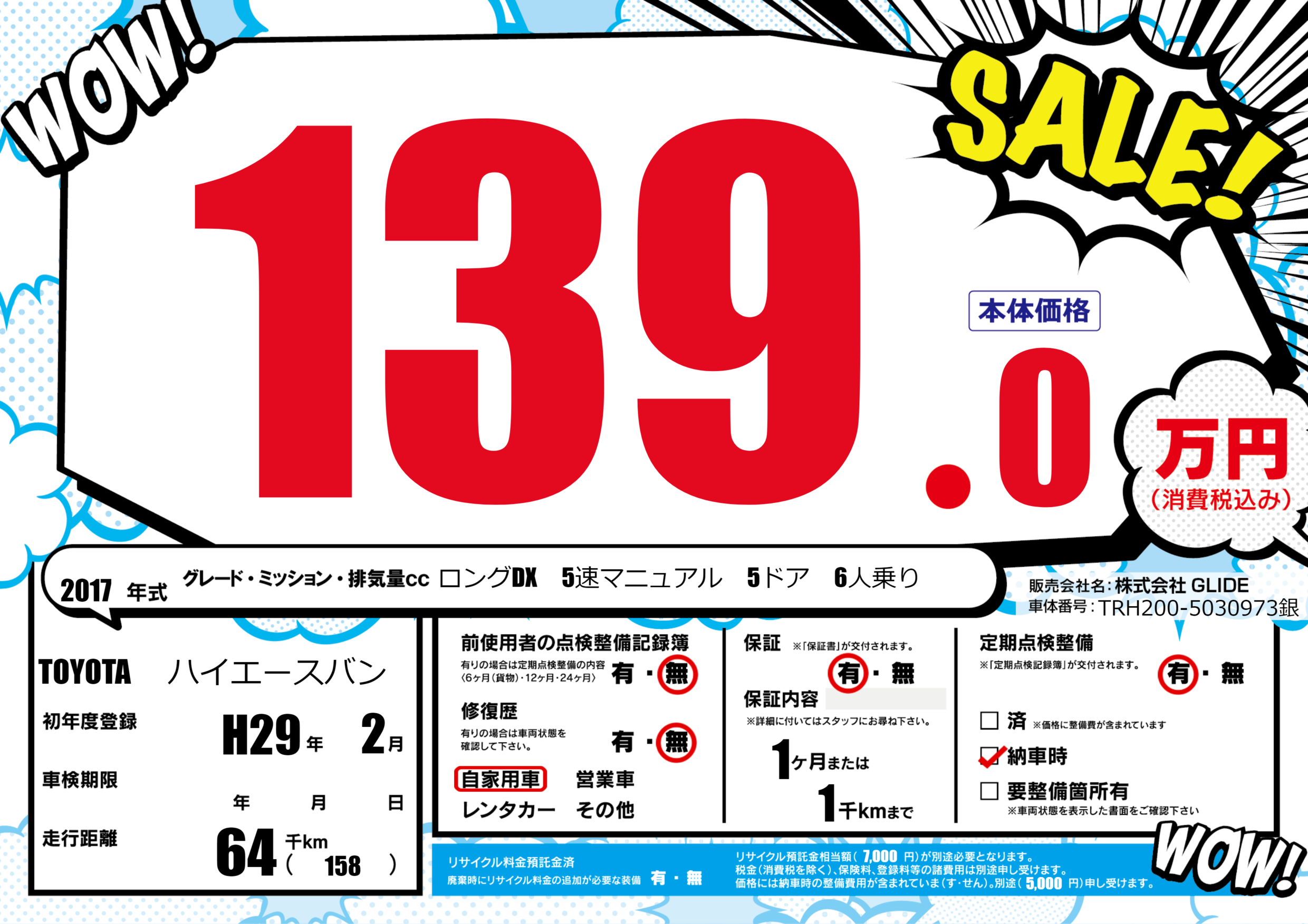 | 車名 | TOYOTA ハイエースバン | グレード ミッション 排気量 |