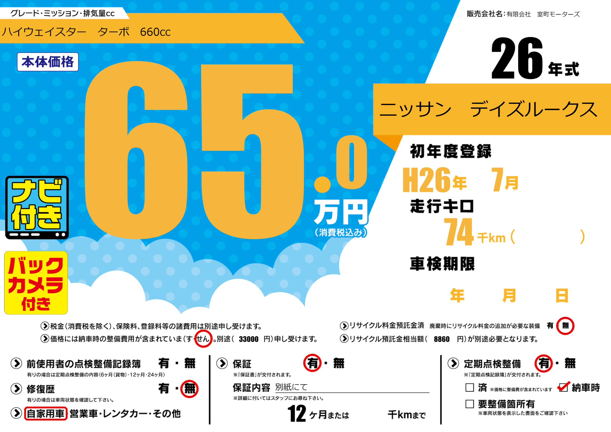 | 車名 | ニッサン デイズルークス | グレード ミッション 排気量 |
