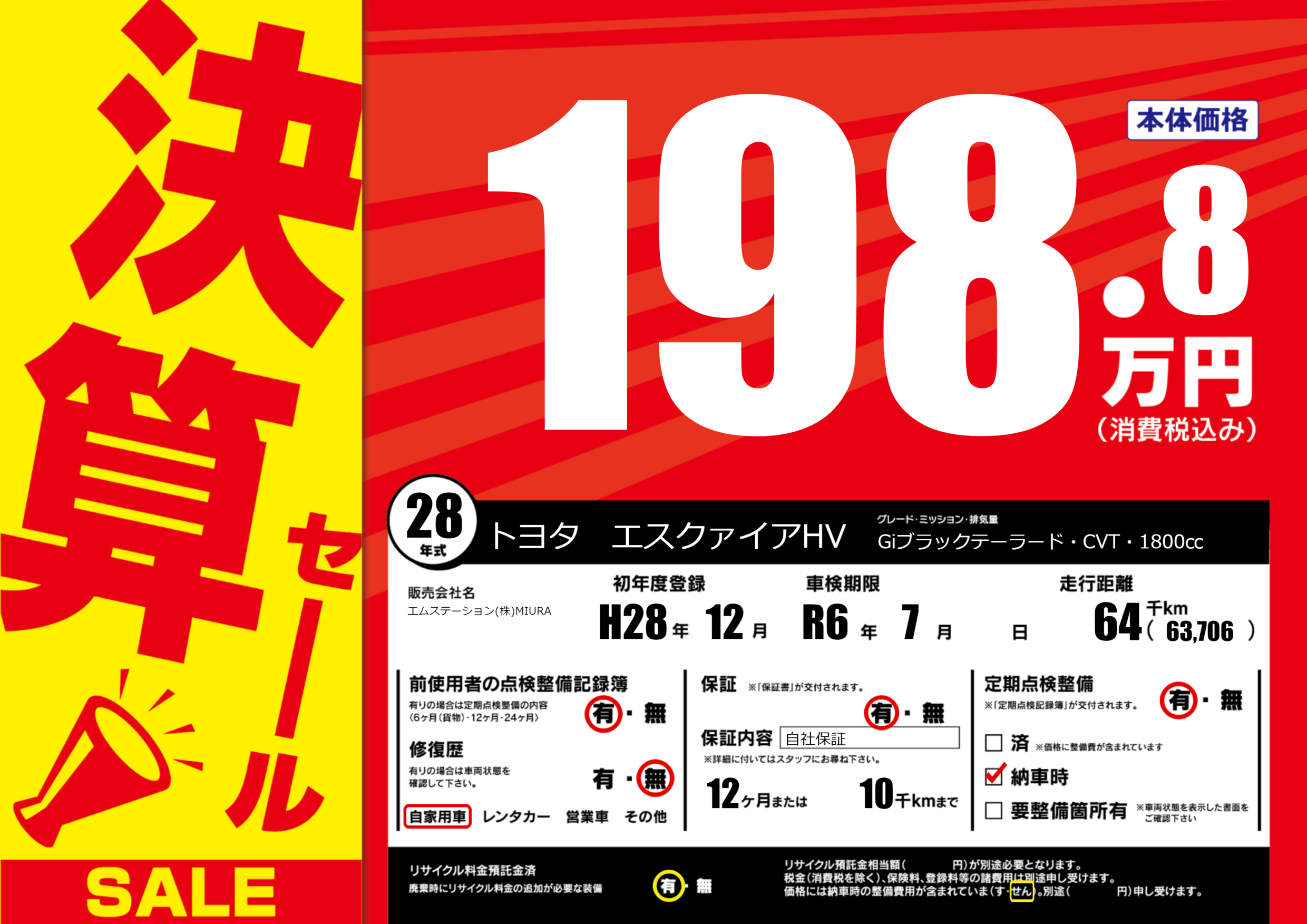 | 車名 | トヨタ エスクァイアHV | グレード ミッション 排気量 |