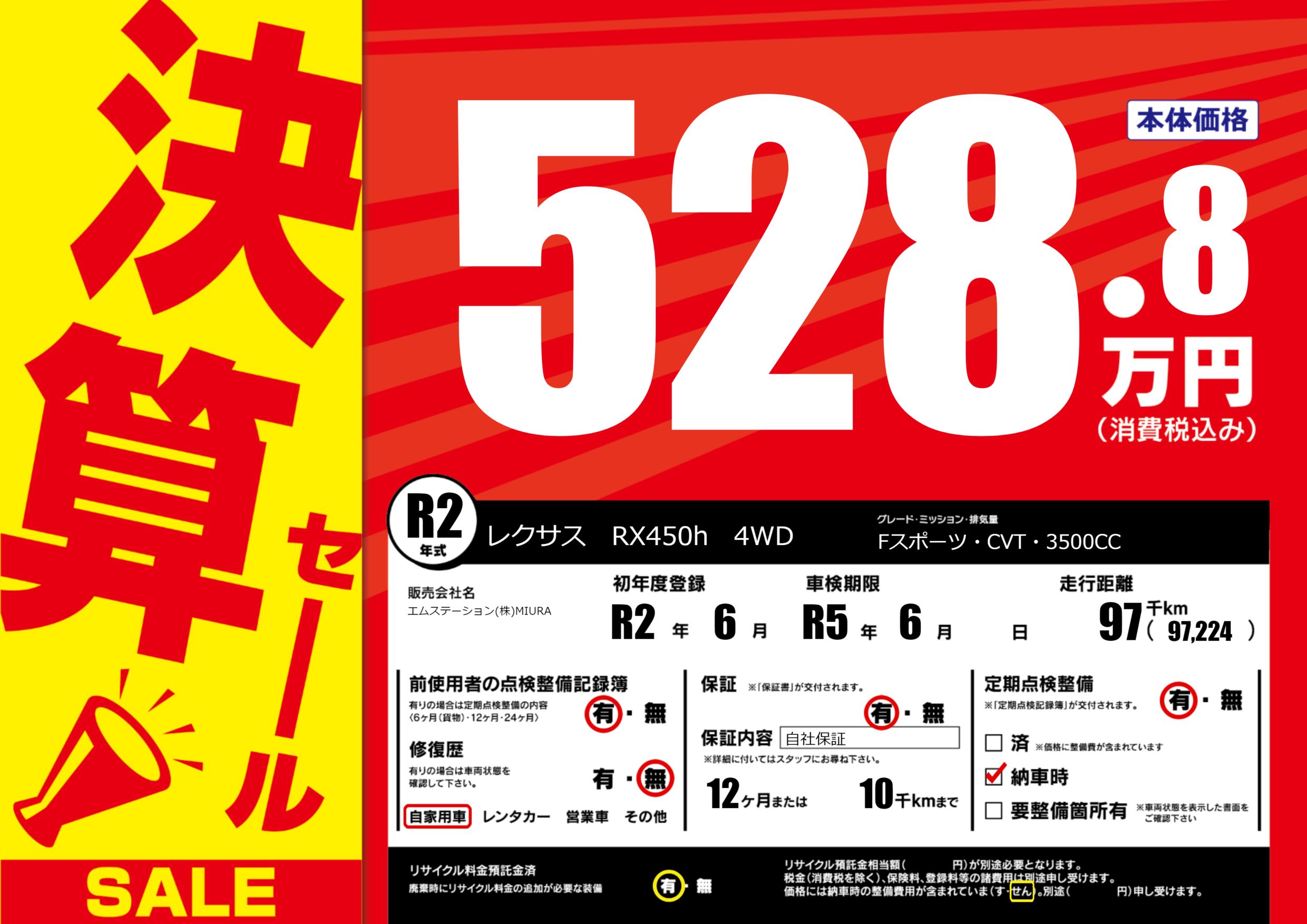 | 車名 | レクサス RX450h 4WD | グレード ミッション 排気量 |