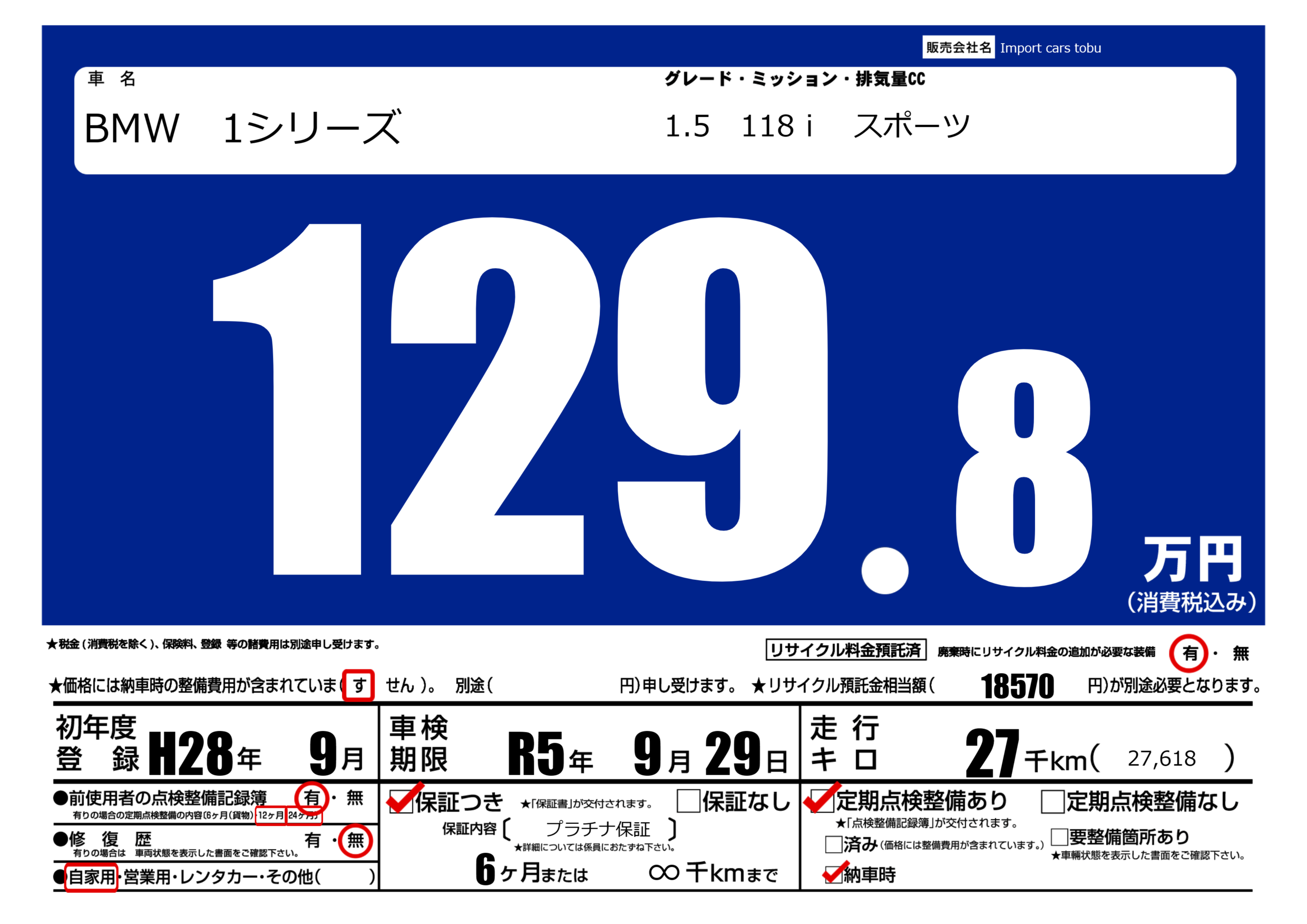 保証付き 保証内容( プラチナ保証) 6ヶ月または(∞)千kmまで |