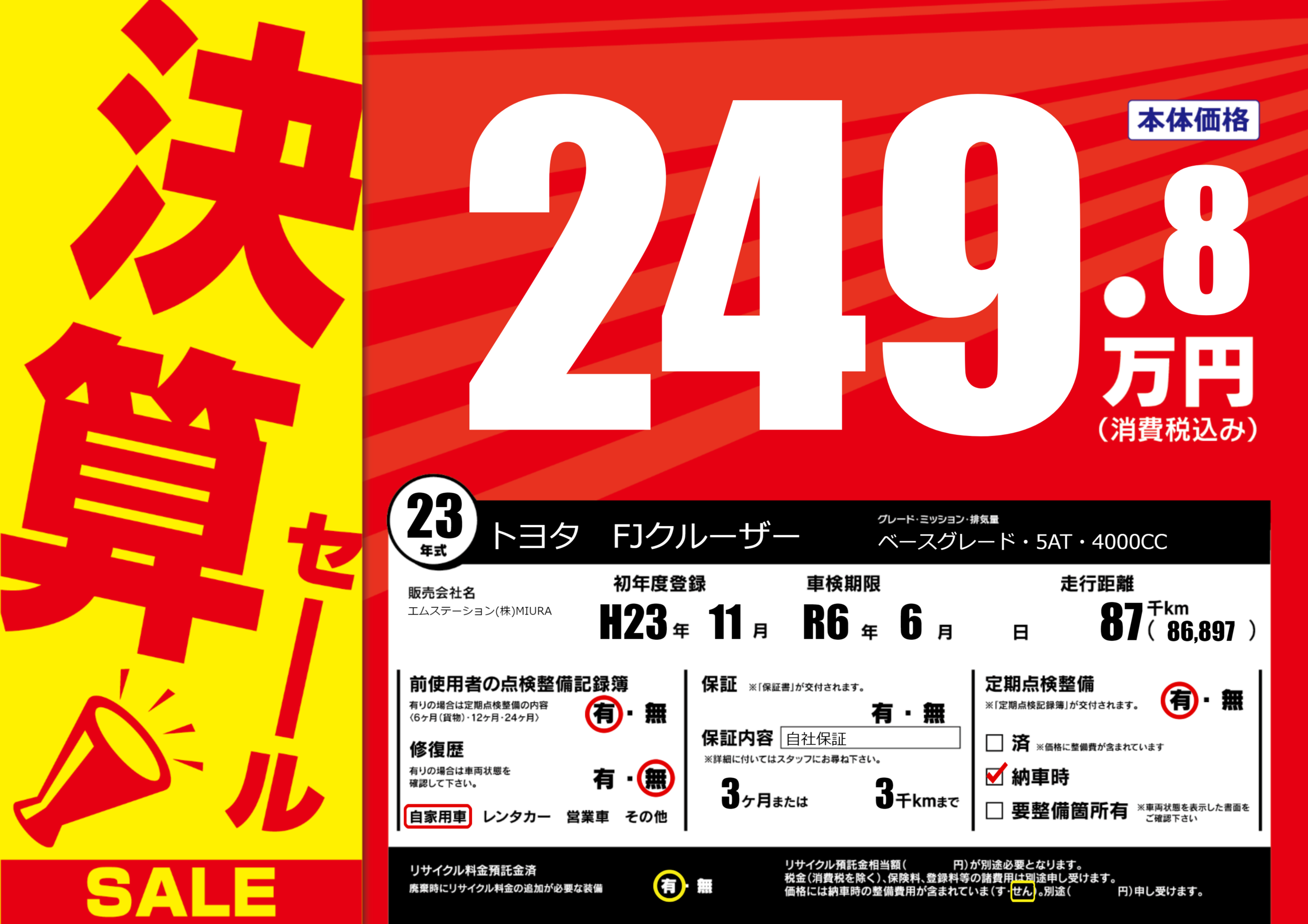| 走行キロ | 8.7万km | 初年度登録 | H23年11月 |