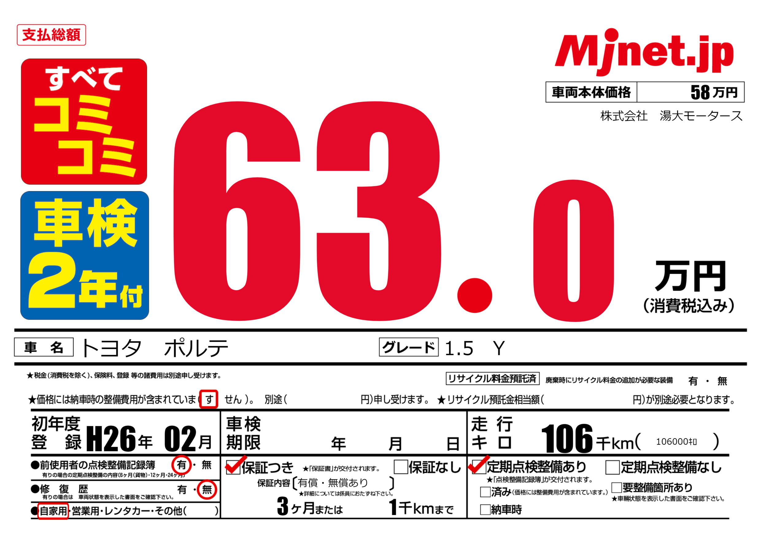 | 車名 | トヨタ ポルテ | グレード ミッション 排気量 |
