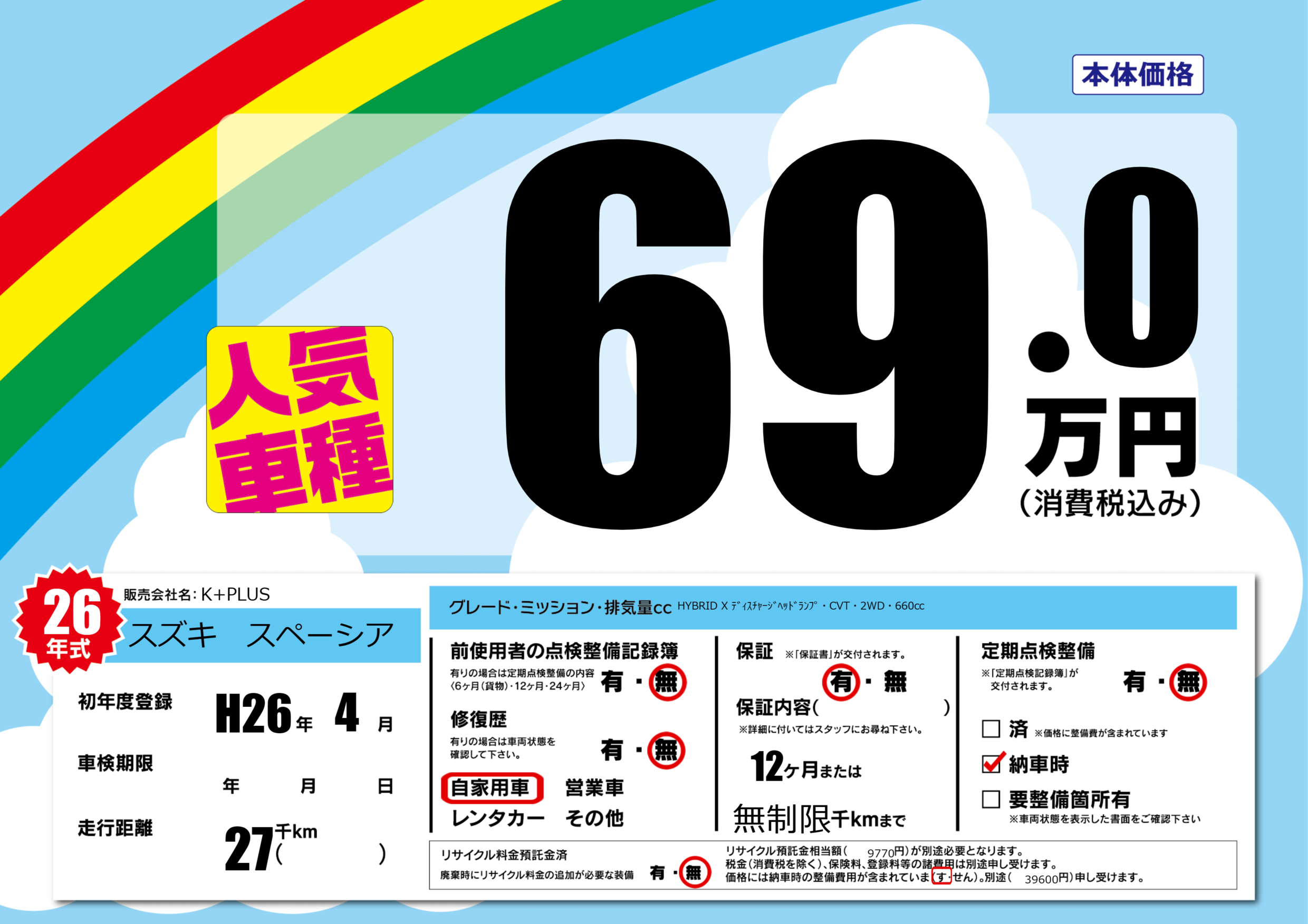 | 走行キロ | 2.7万km | 初年度登録 | H26年4月 |