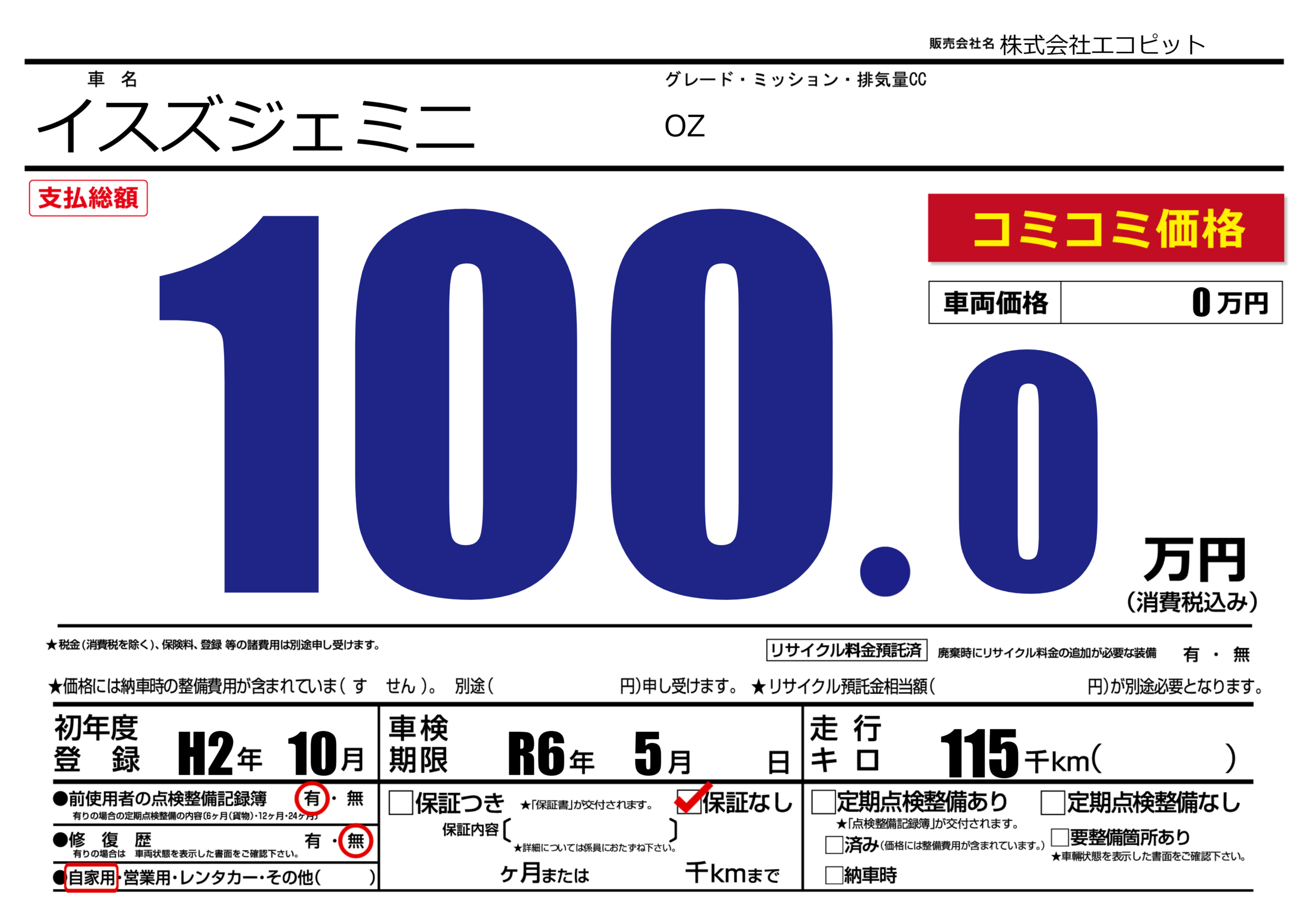 なし | 車検制限 | R6年5月---月 |