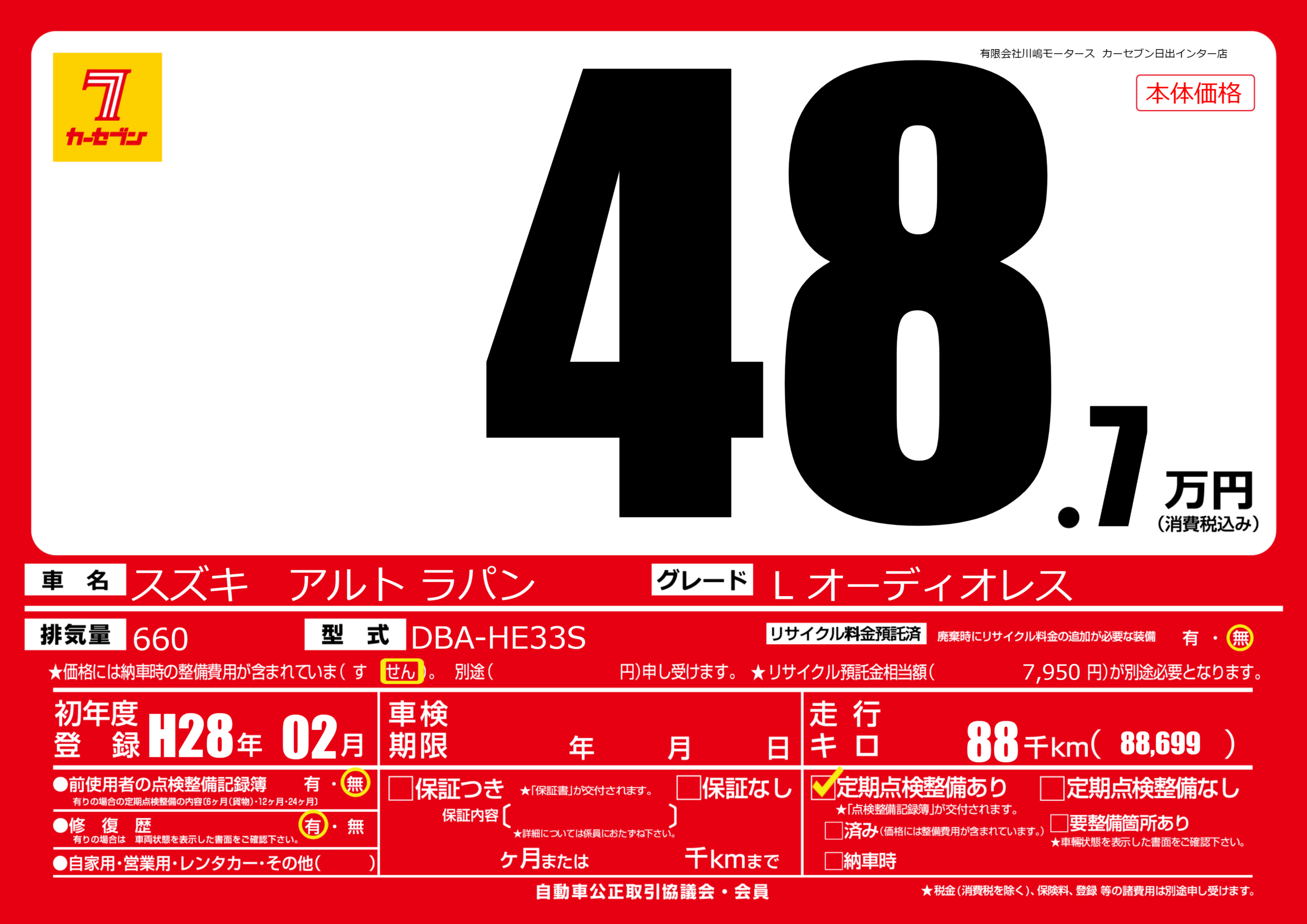 | 車名 | スズキ アルト ラパン | グレード ミッション 排気量 |