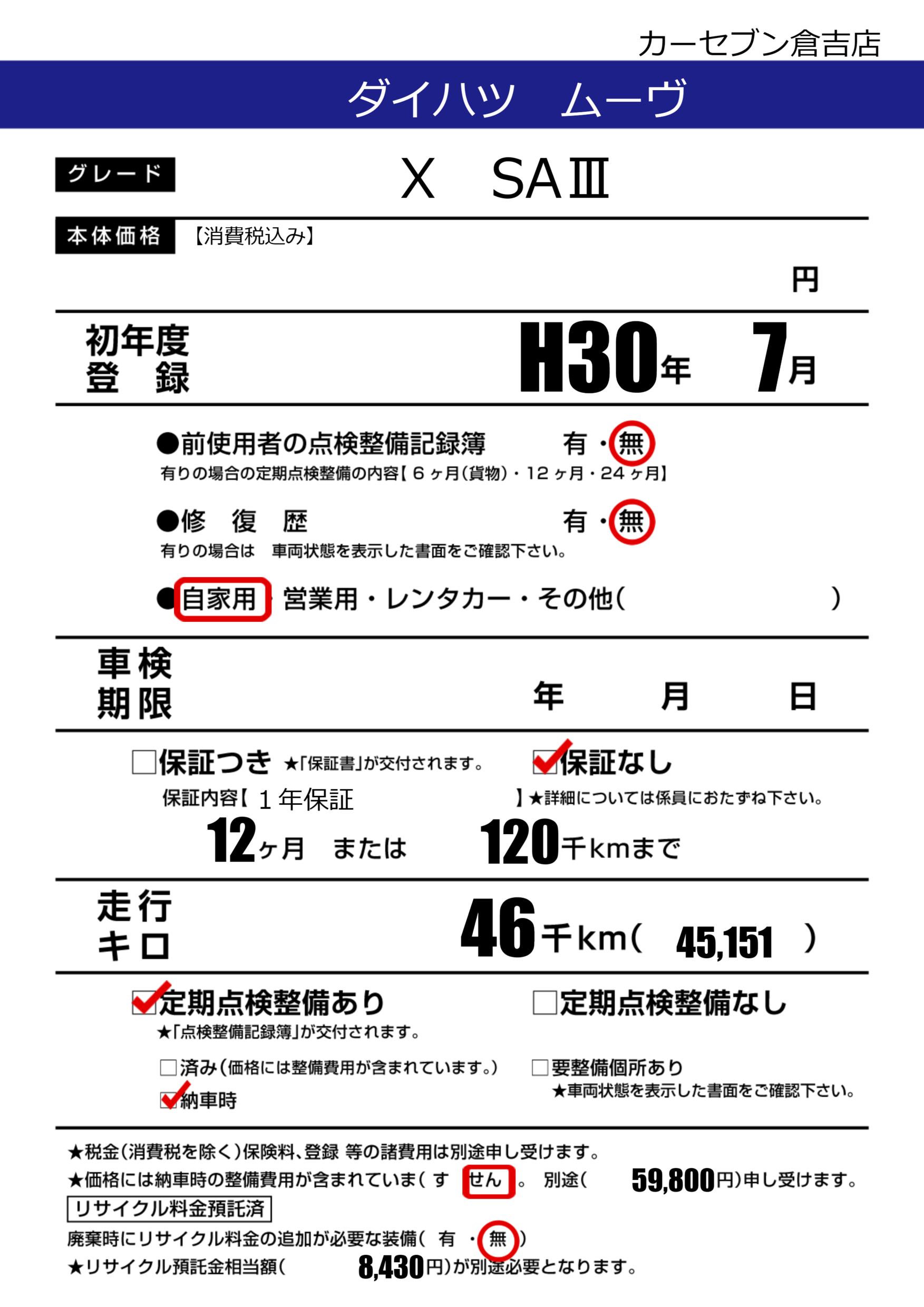 | 走行キロ | 4.6万km | 初年度登録 | H30年7月 |