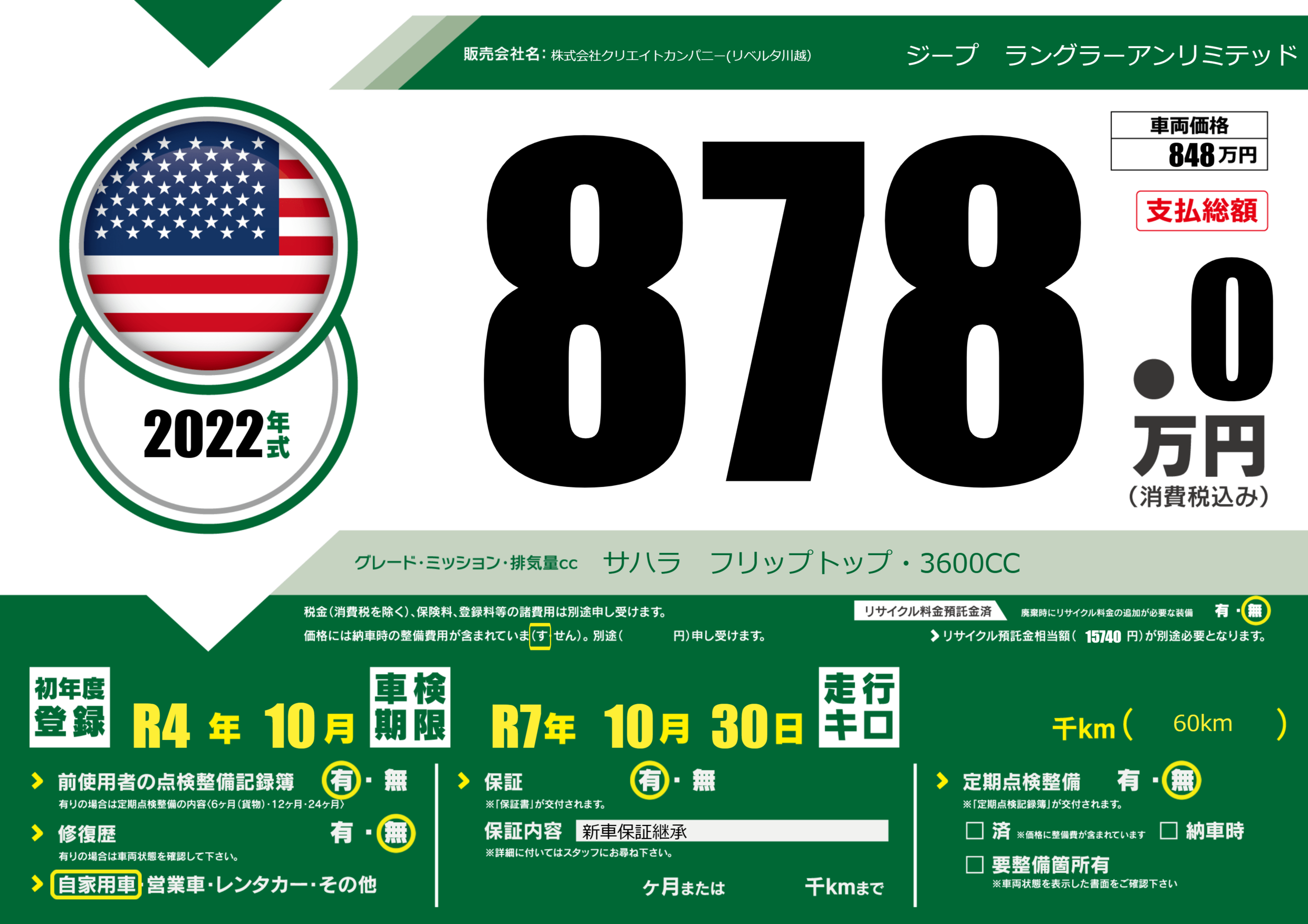 | 走行キロ | - | 初年度登録 | R4年10月 |