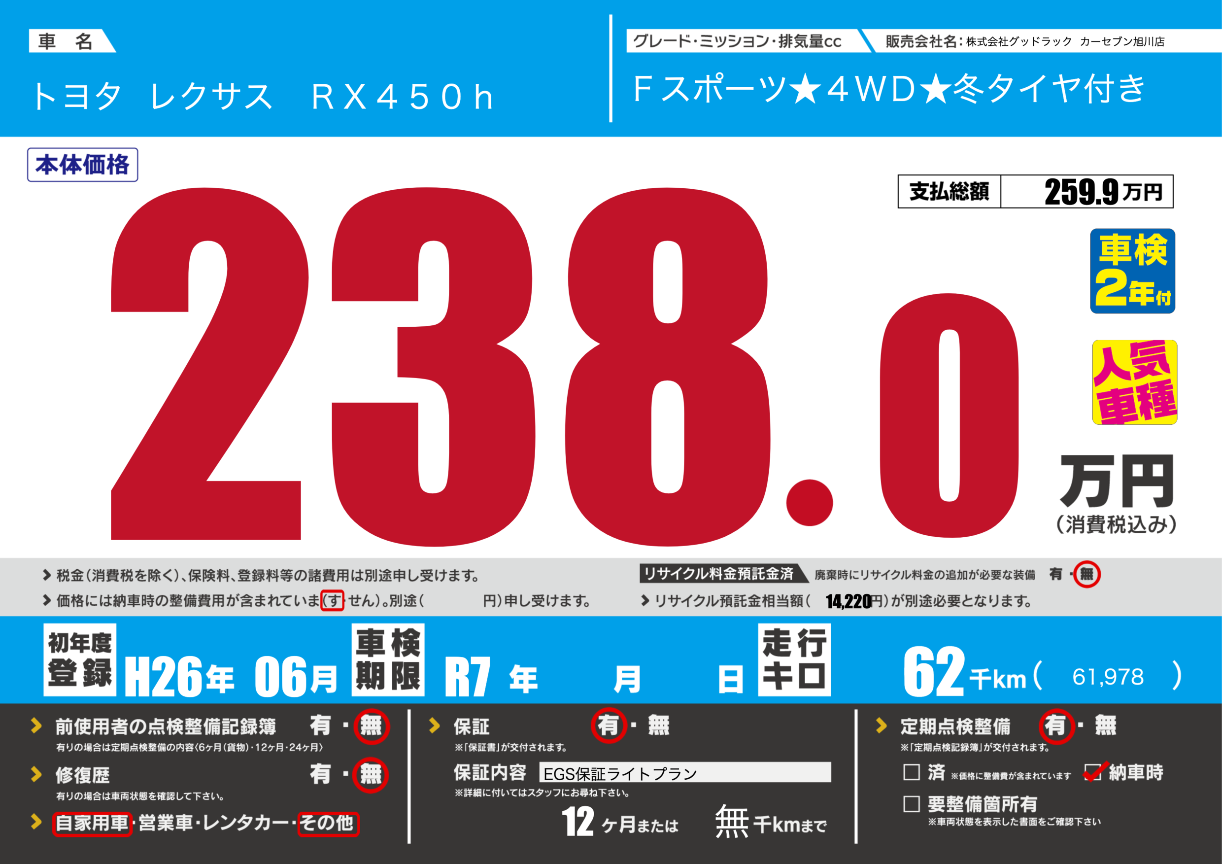 | 車名 | トヨタ レクサス RX450h | グレード ミッション 排気量 |
