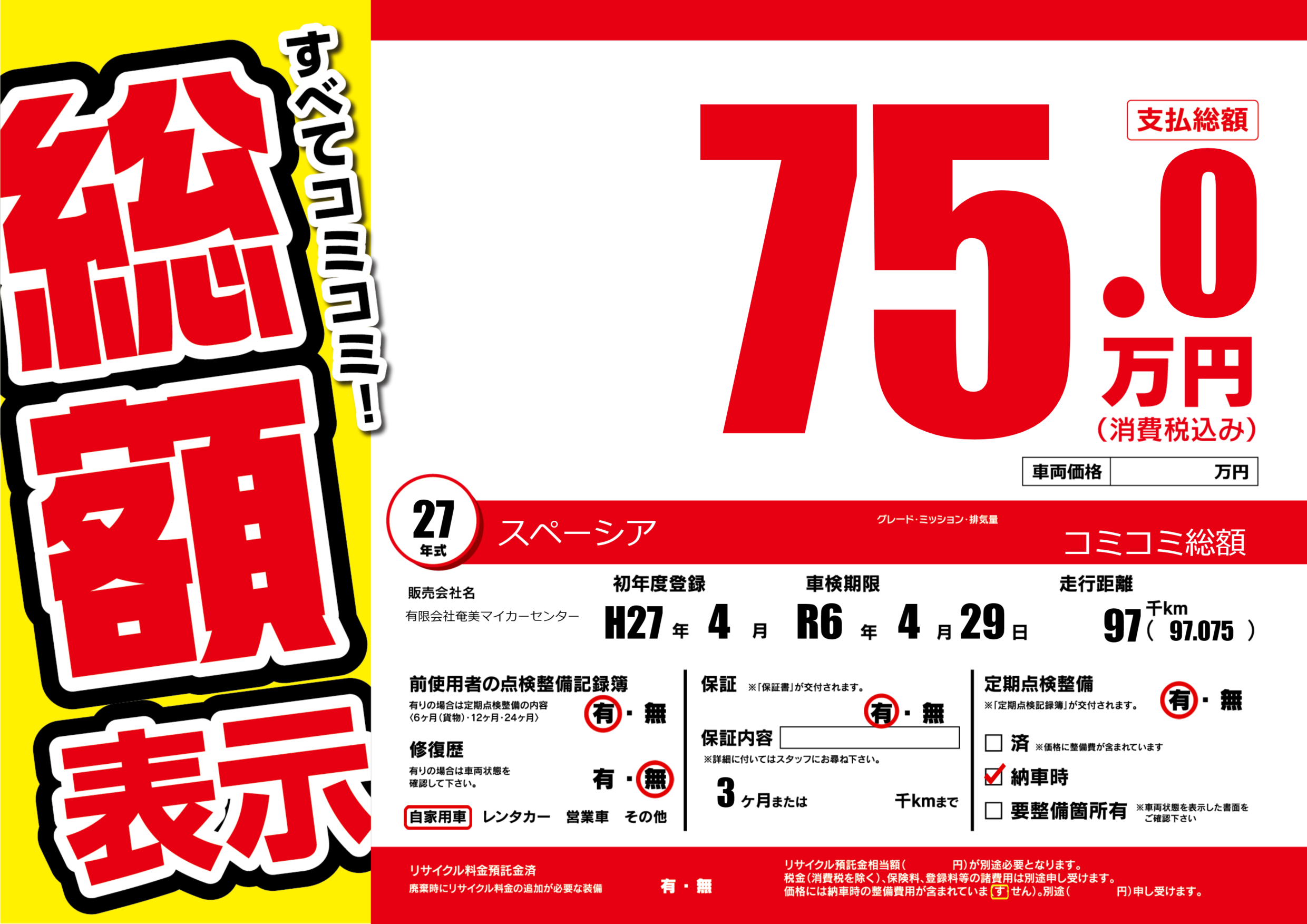 | 定期点検整備 | 定期点検整備あり 納車時あり | ||