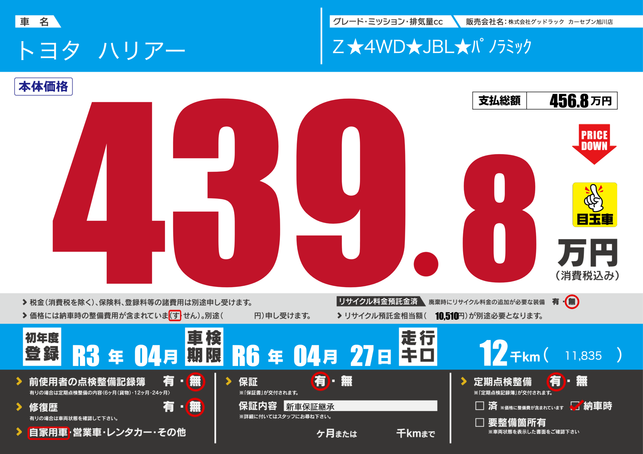 | 走行キロ | 1.2万km | 初年度登録 | R3年04月 |