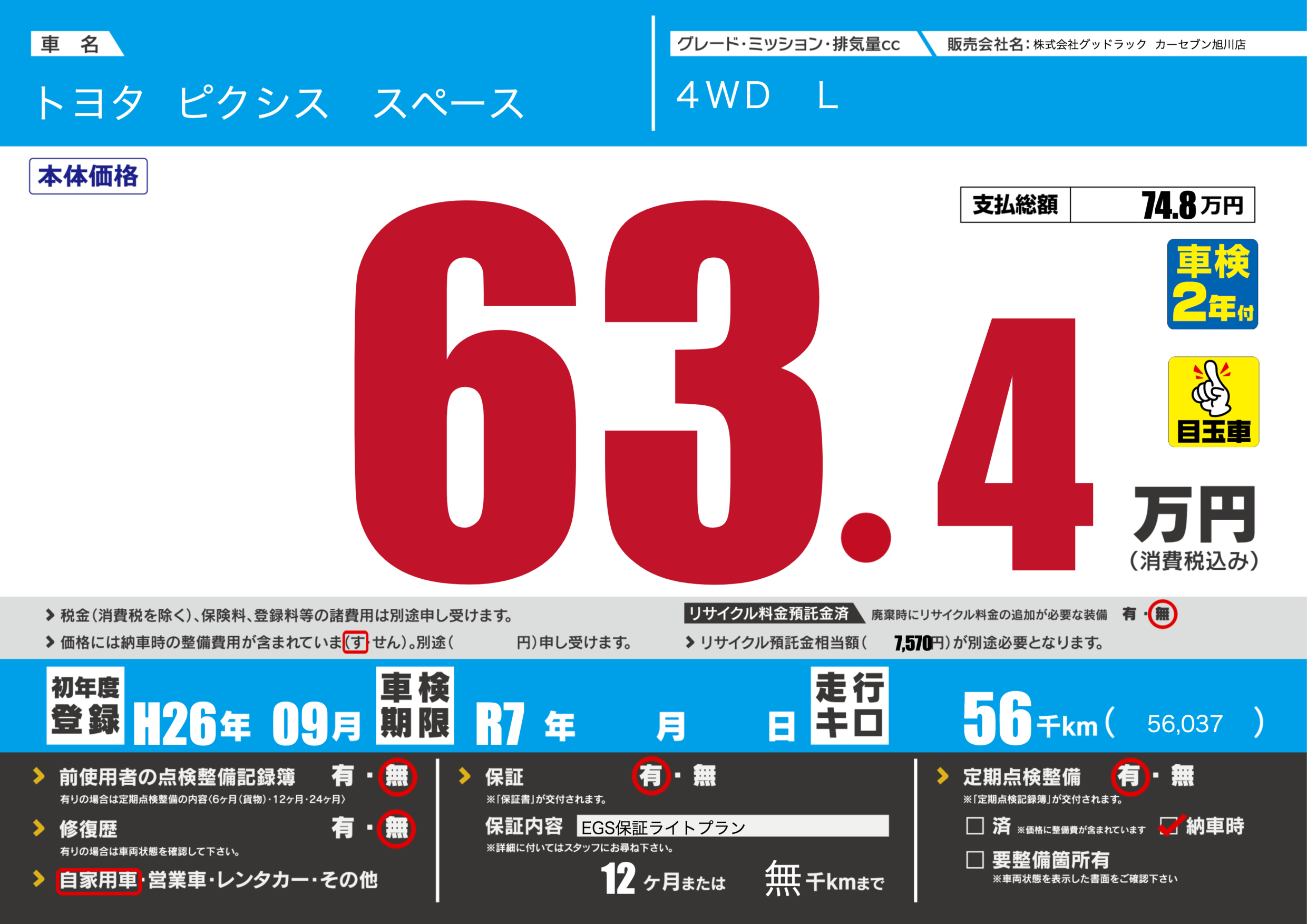 | 車名 | トヨタ ピクシス スペース | グレード ミッション 排気量 |