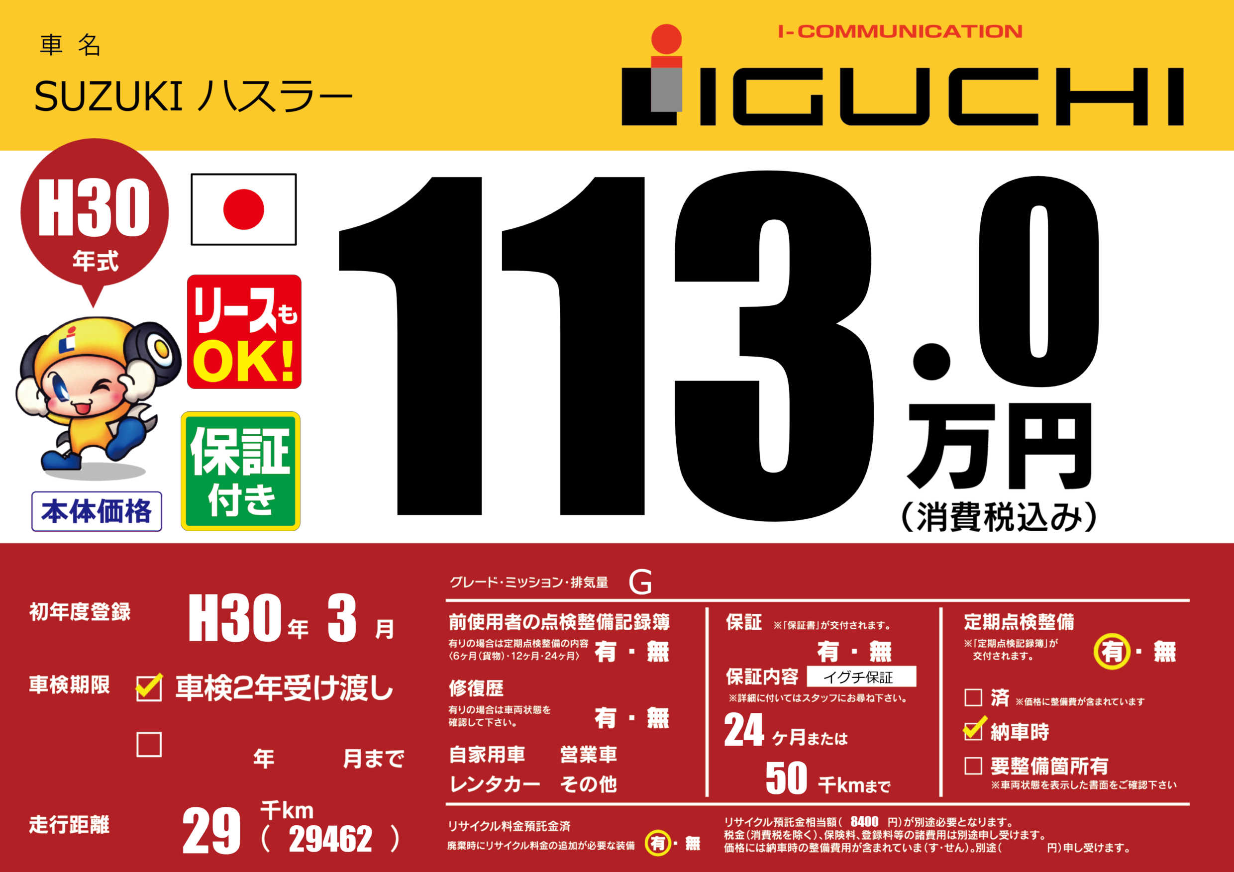 保証なし 保証内容(イグチ保証) 24ヶ月または(50)千kmまで |