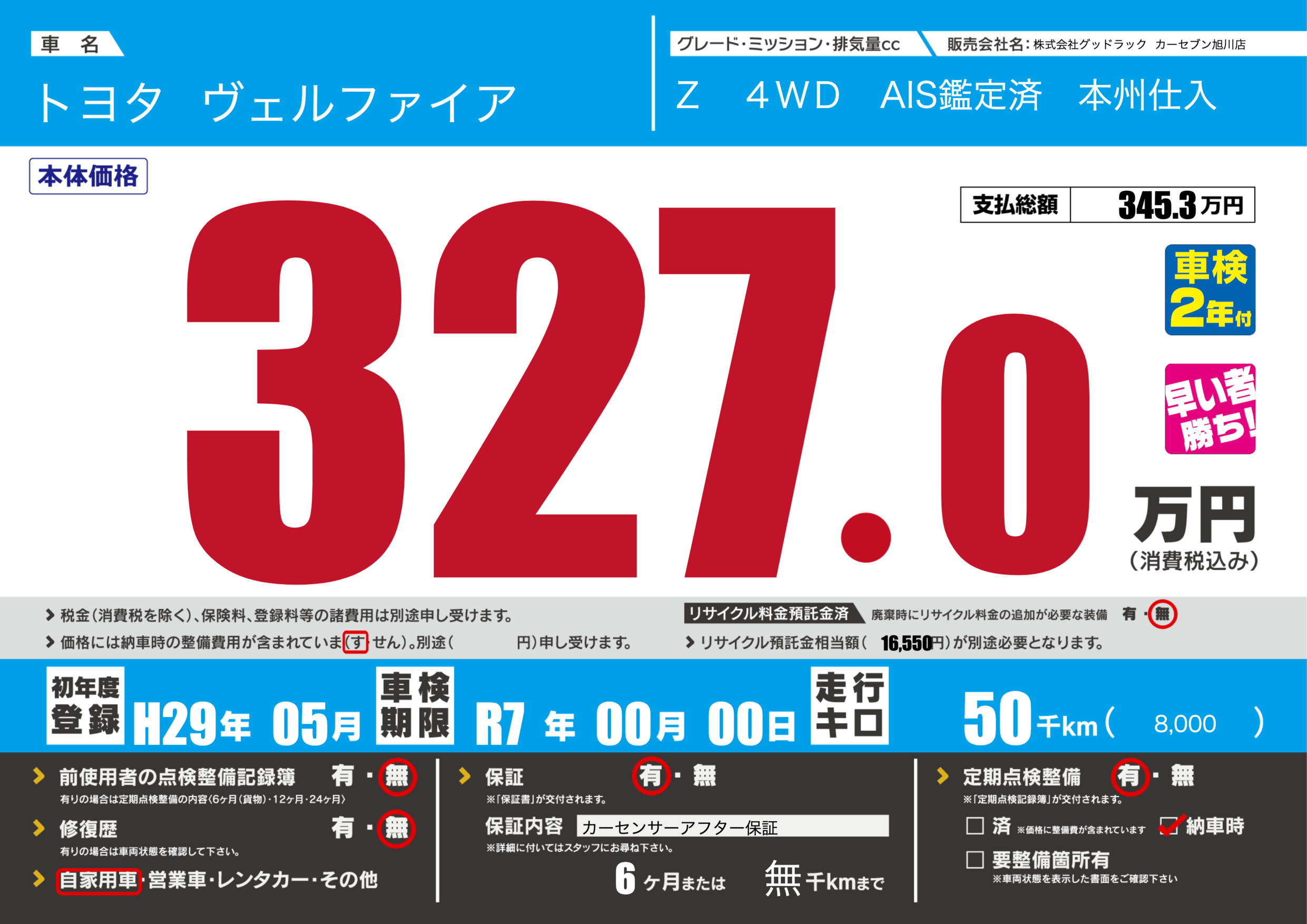 | 車名 | トヨタ ヴェルファイア | グレード ミッション 排気量 |