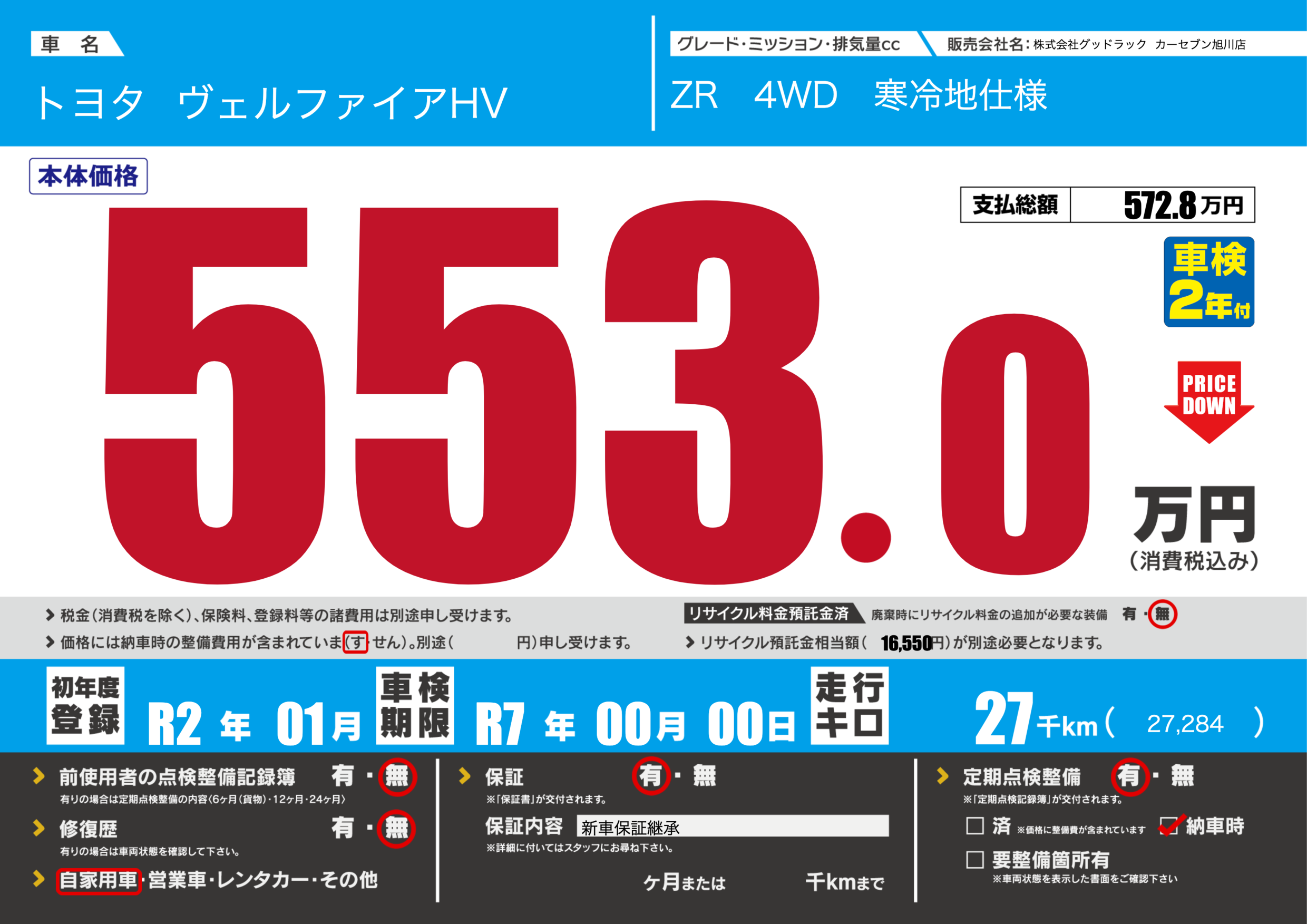 | 車名 | トヨタ ヴェルファイアHV | グレード ミッション 排気量 |
