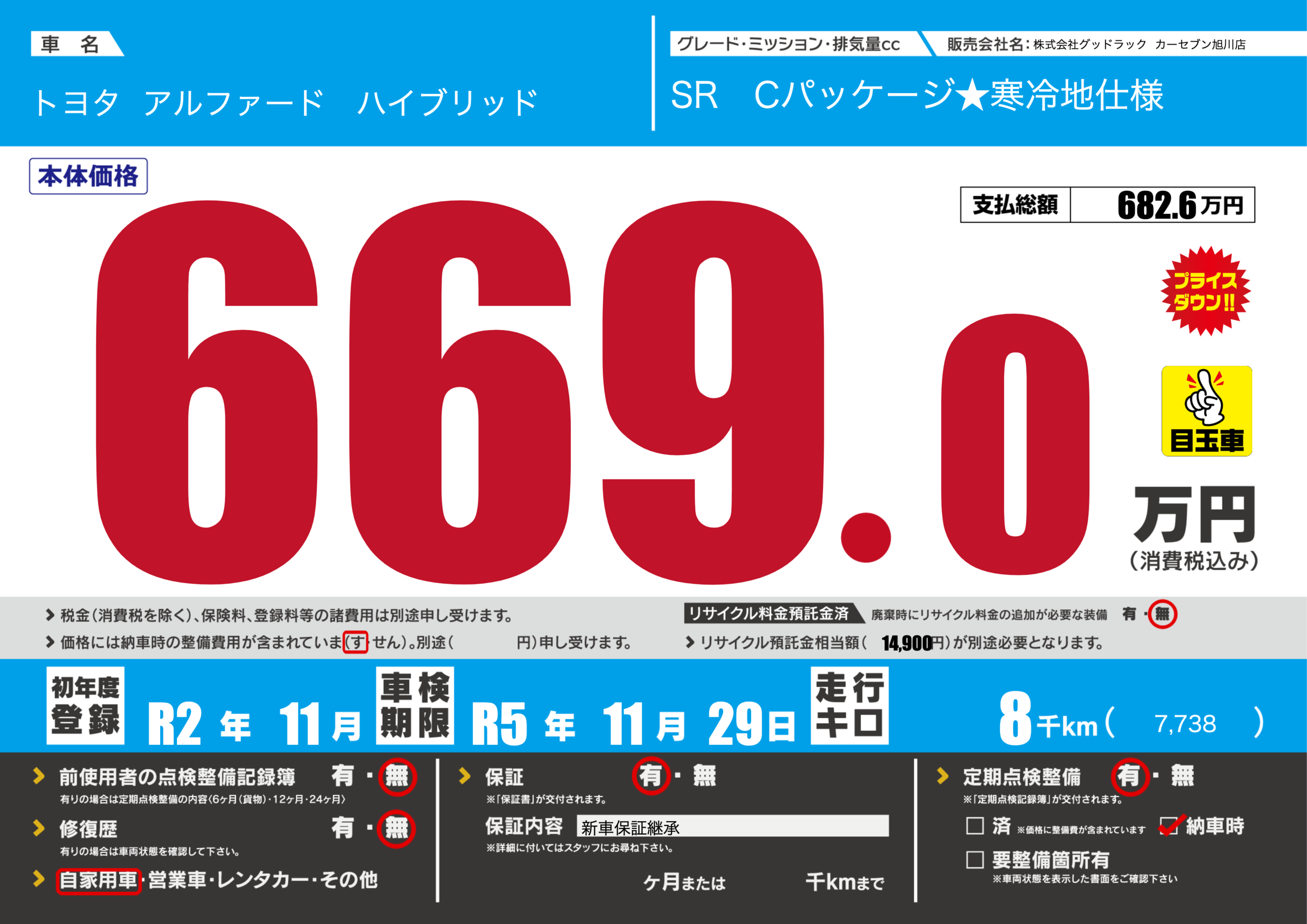 | 走行キロ | 0.8万km | 初年度登録 | R2年11月 |