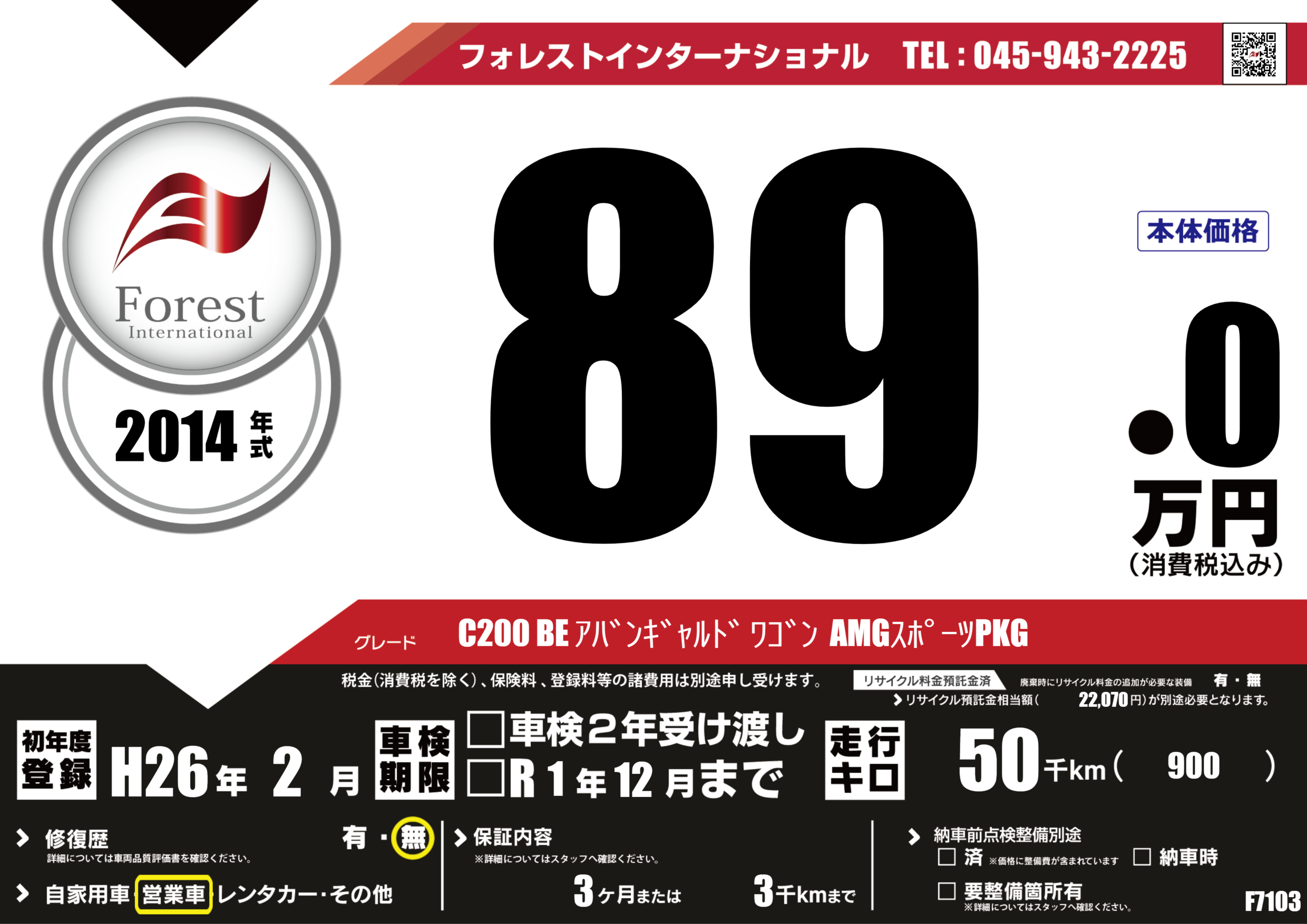 | 走行キロ | 5万km | 初年度登録 | H26年2月 |