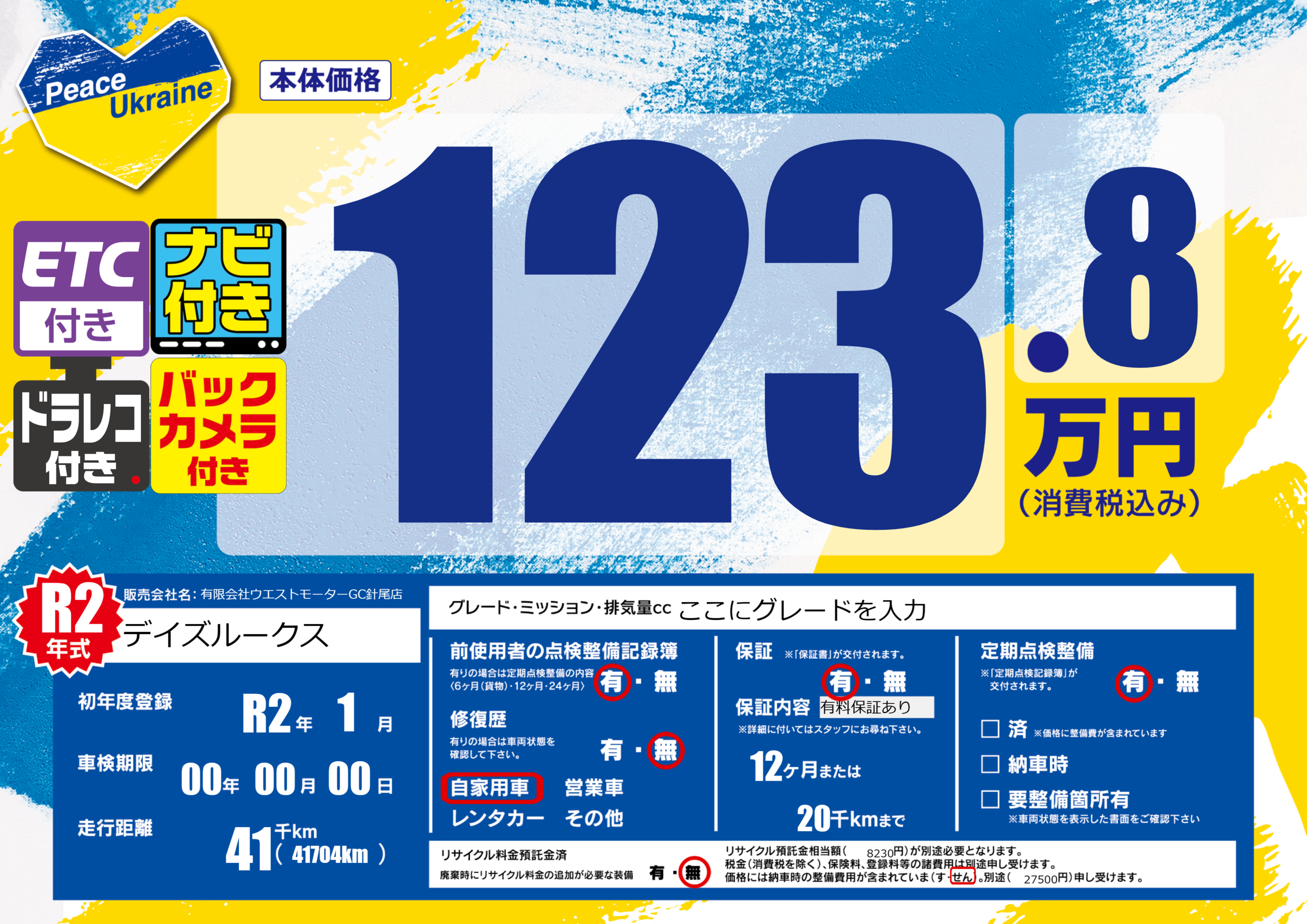 | 走行キロ | 4.1万km | 初年度登録 | R2年1月 |