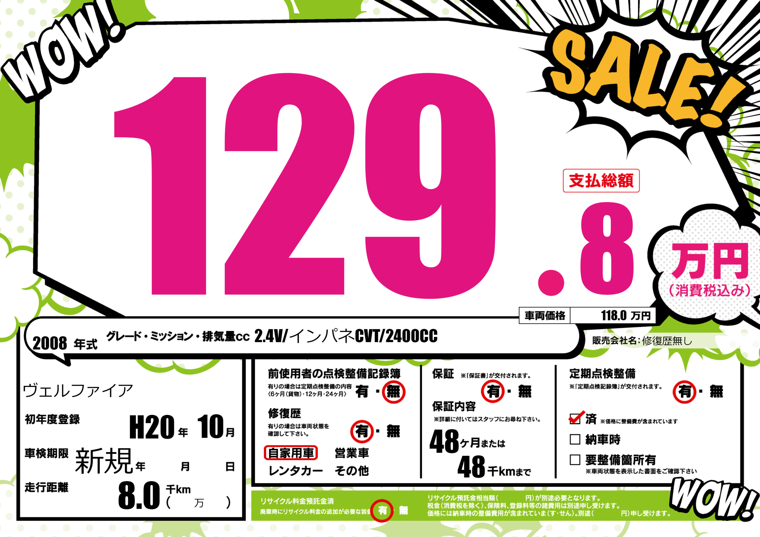 | 定期点検整備 | 定期点検整備あり 定期点検整備済み | ||