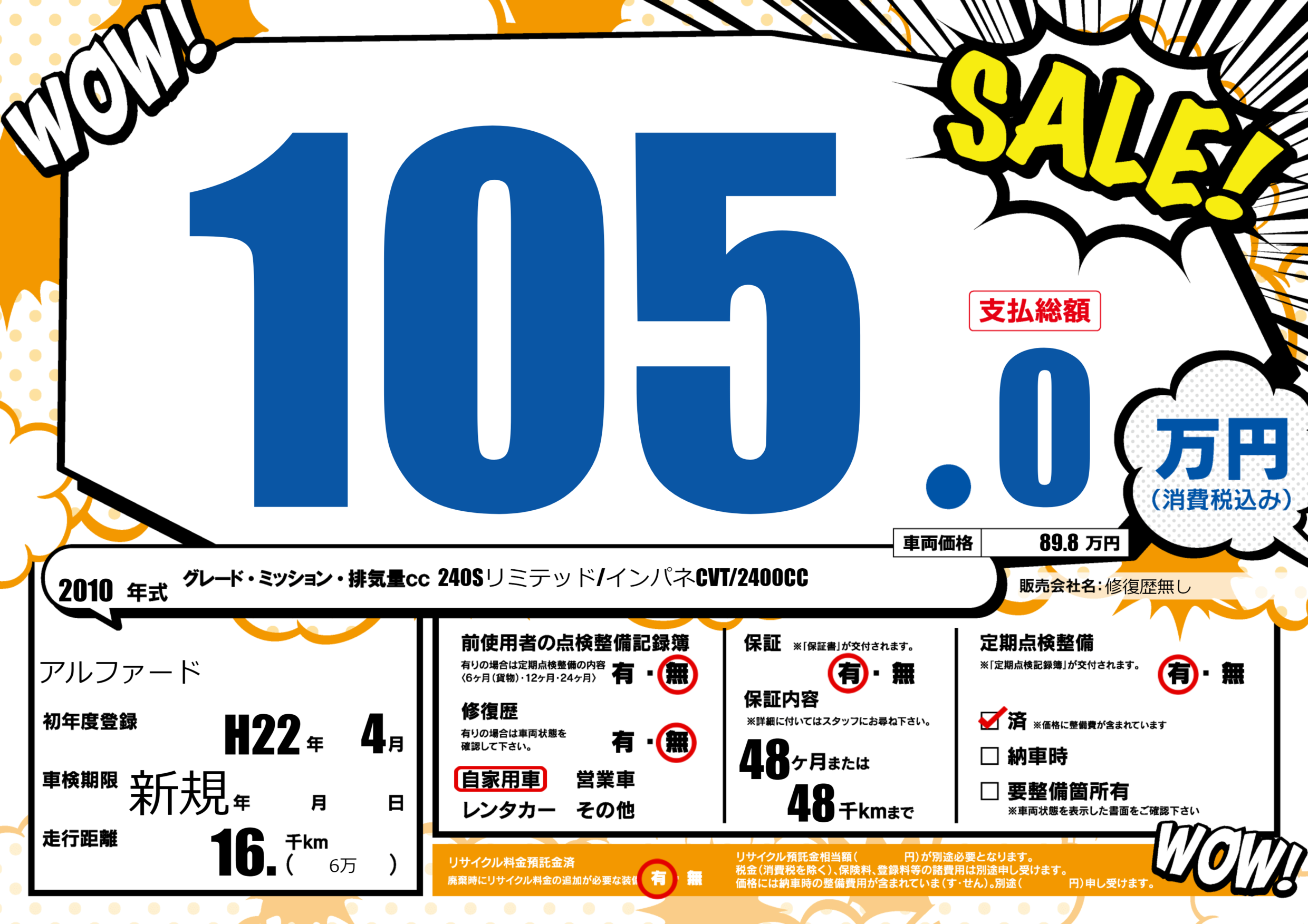 | 定期点検整備 | 定期点検整備あり 定期点検整備済み | ||