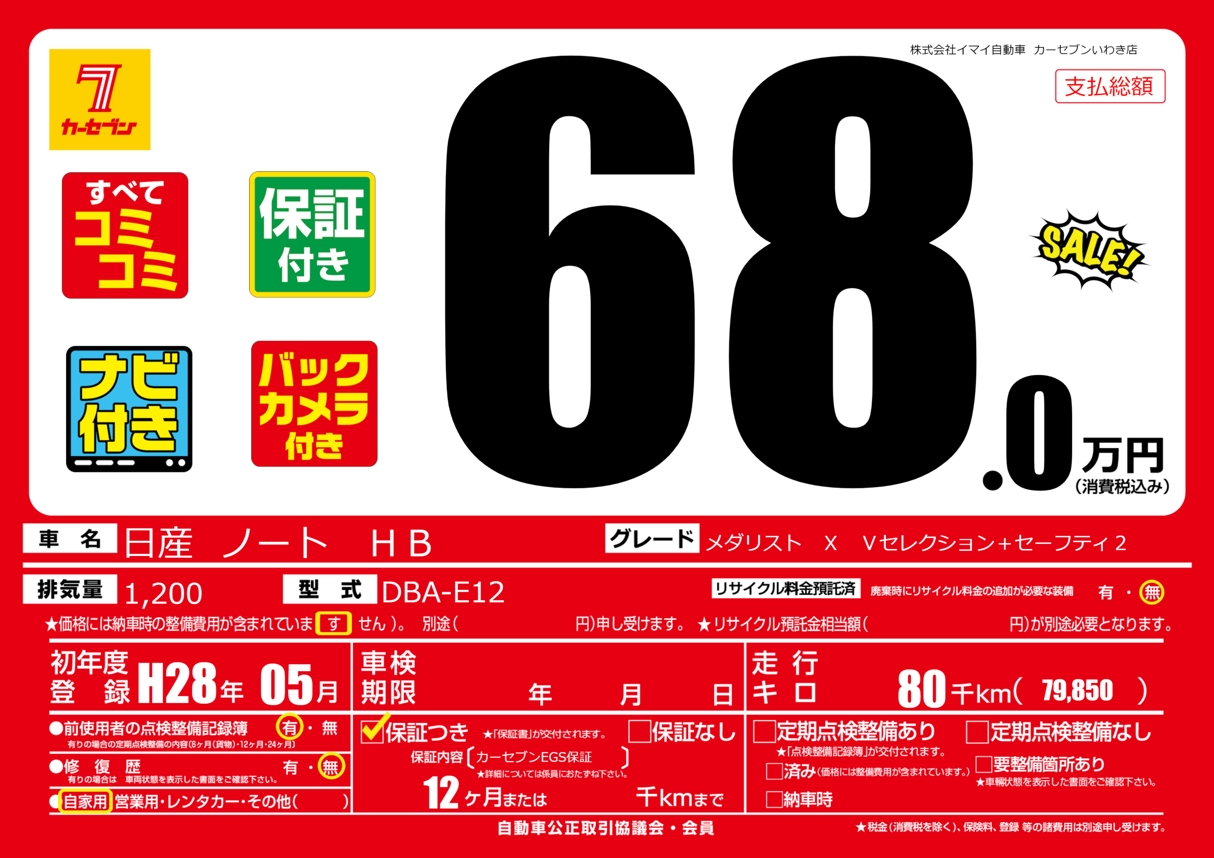 | 車名 | 日産 ノート HB | グレード ミッション 排気量 |