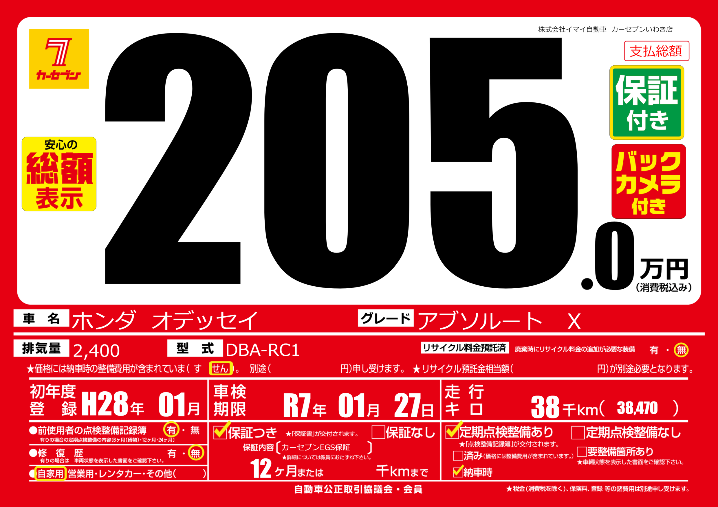 | 車名 | ホンダ オデッセイ | グレード ミッション 排気量 |