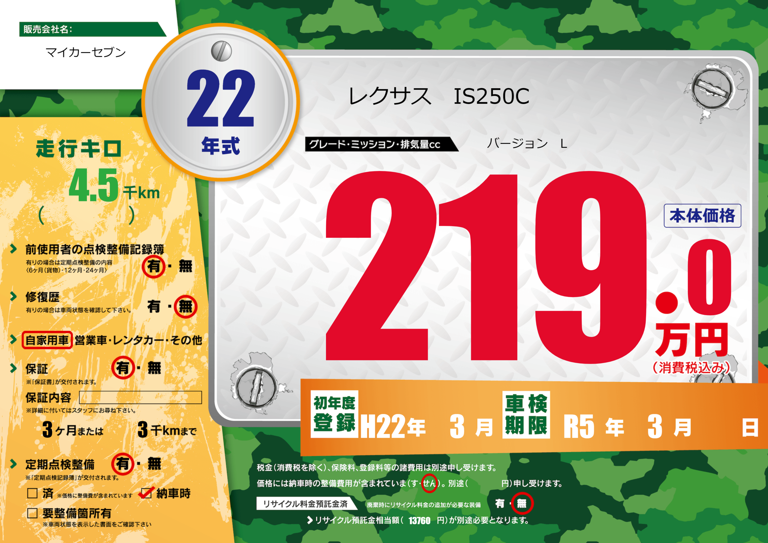 | 車名 | レクサス IS250C | グレード ミッション 排気量 |
