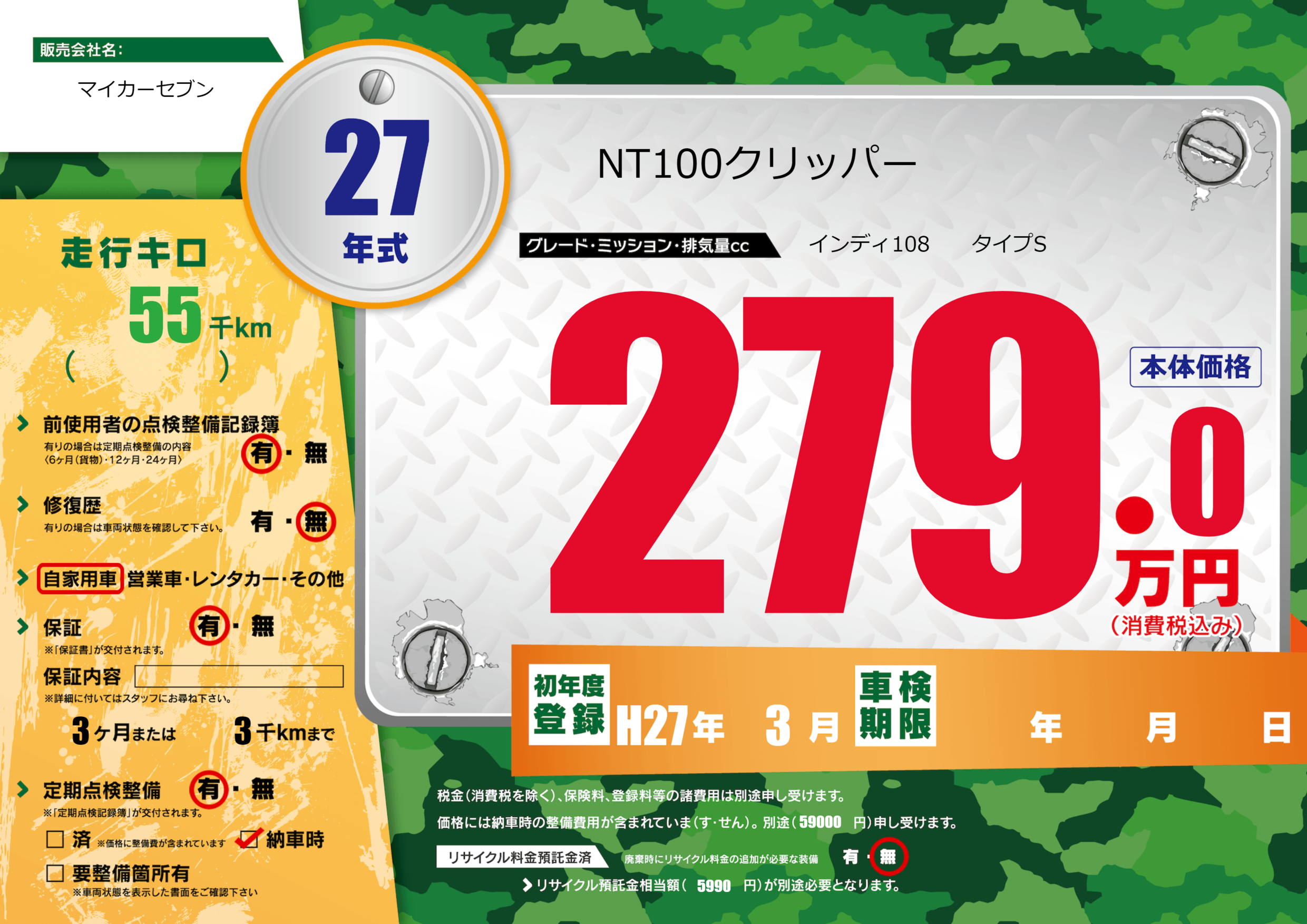 保証付き 保証内容(---) 3ヶ月または(3)千kmまで |