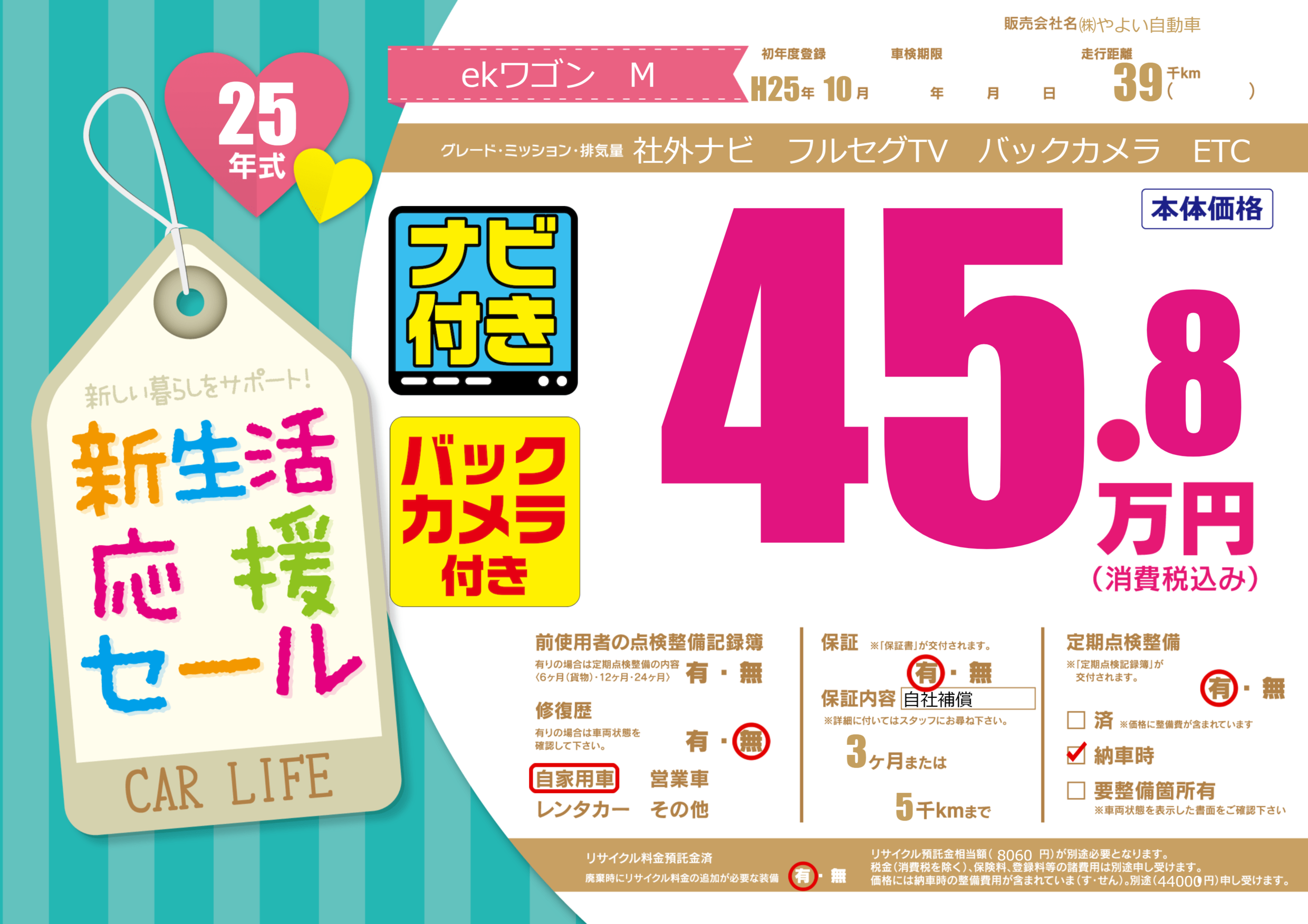 | 定期点検整備 | 定期点検整備あり 納車時あり | ||