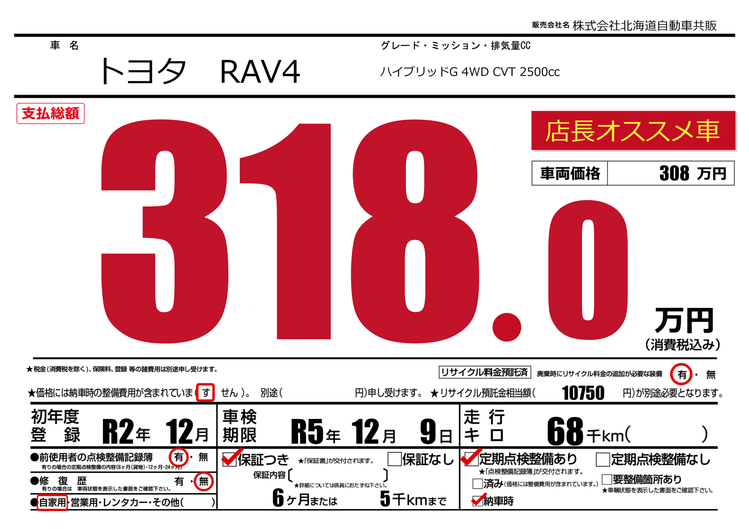 | 車名 | トヨタ RAV4 | グレード ミッション 排気量 |