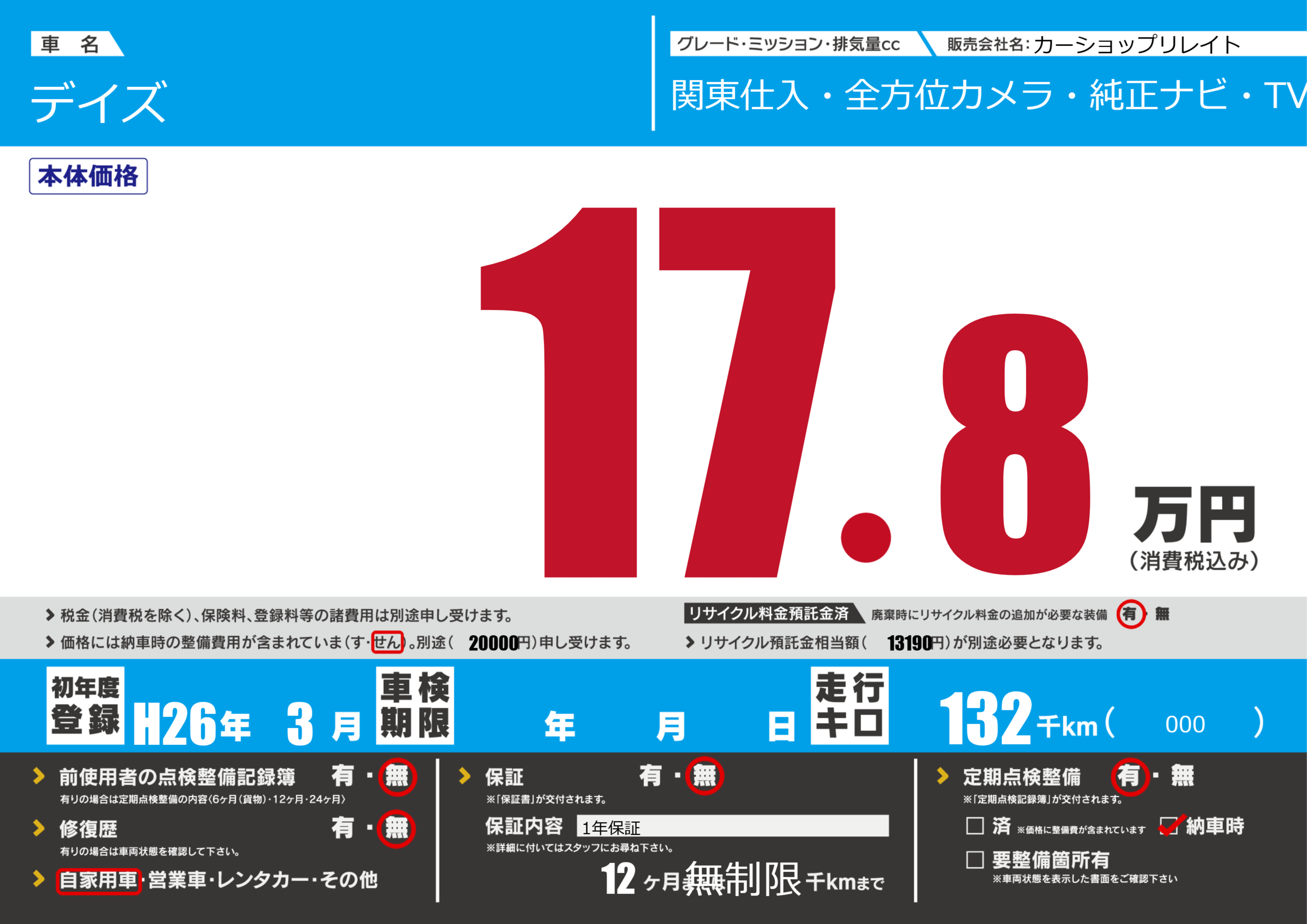 | 走行キロ | 13.2万km | 初年度登録 | H26年3月 |