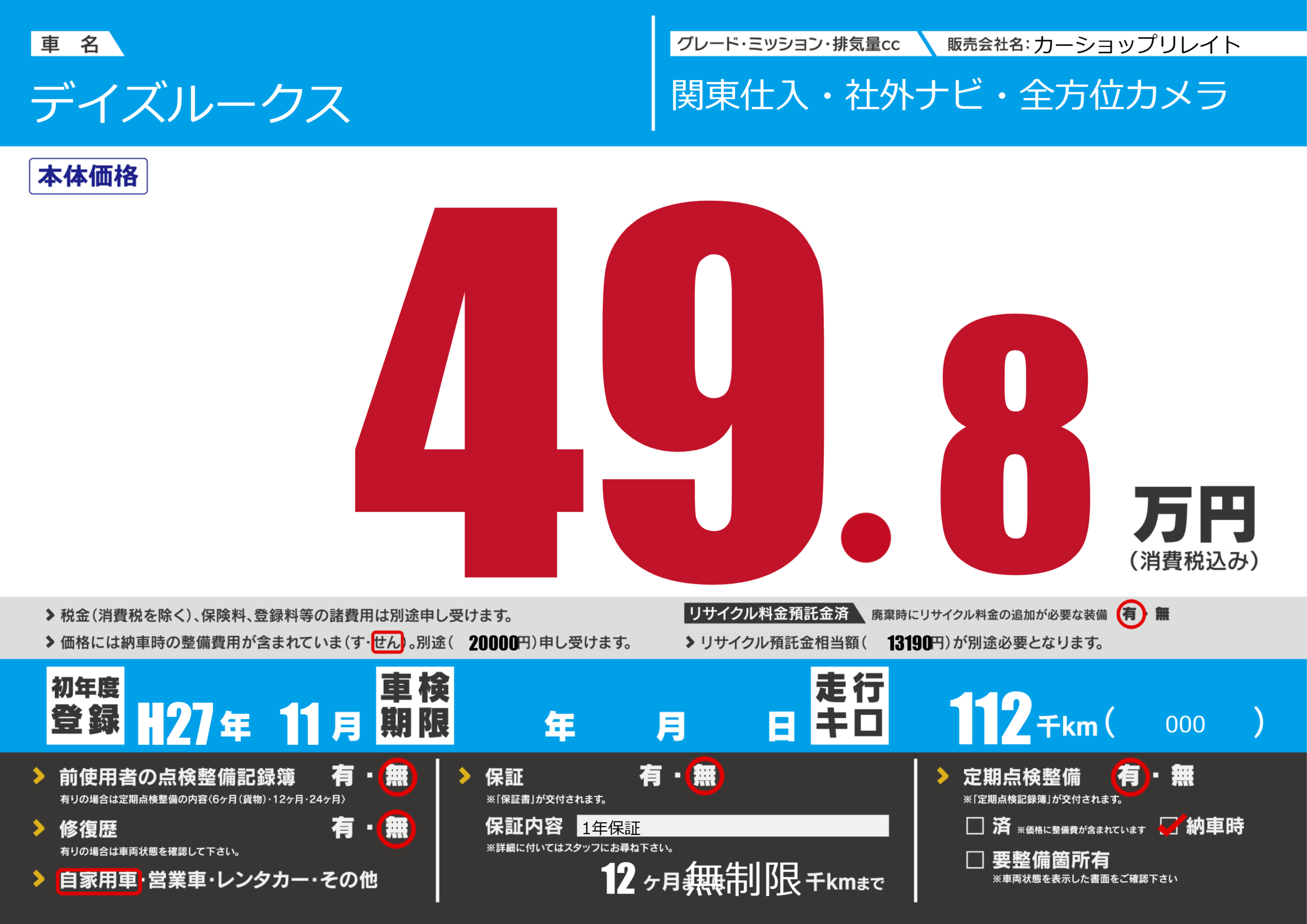 | 車名 | デイズルークス | グレード ミッション 排気量 |