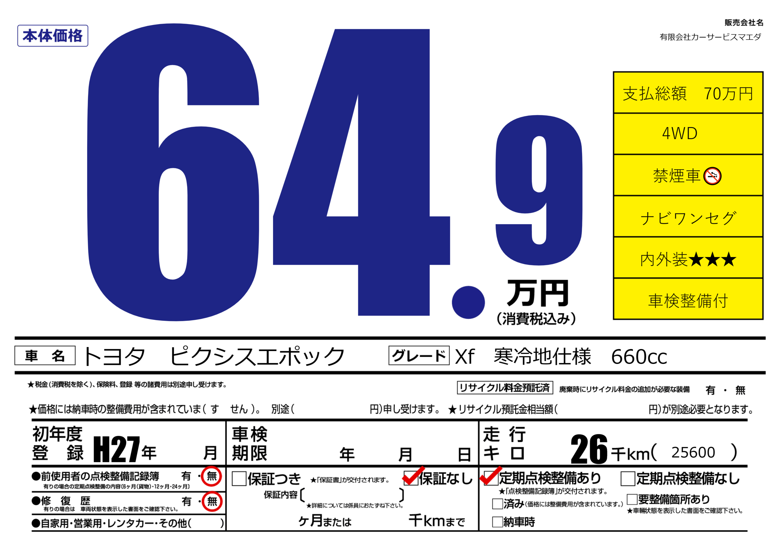 | 車名 | トヨタ ピクシスエポック | グレード ミッション 排気量 |